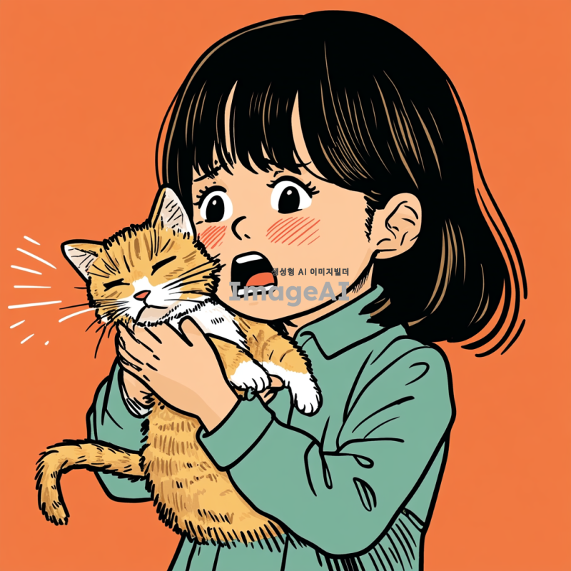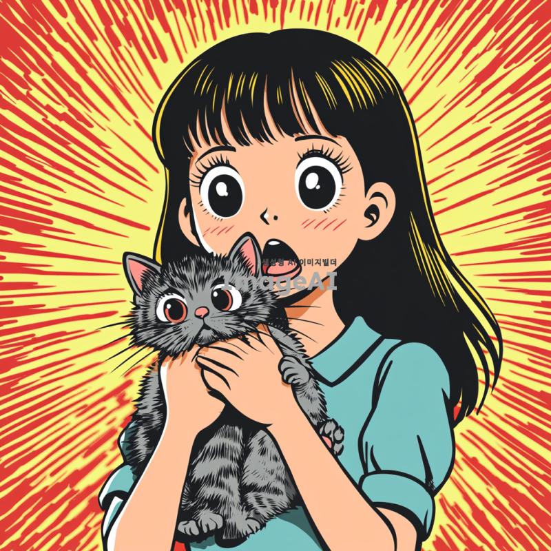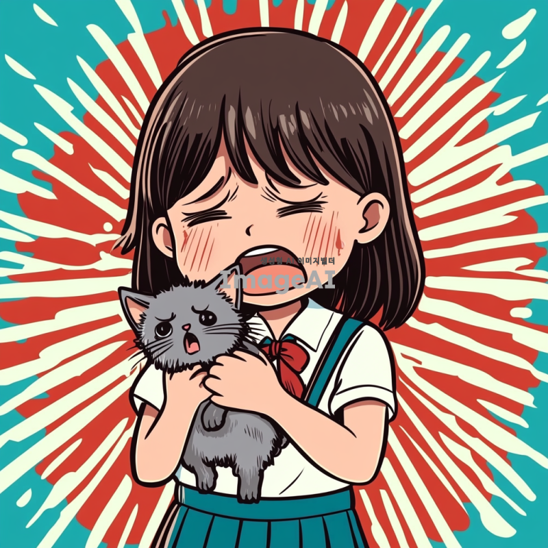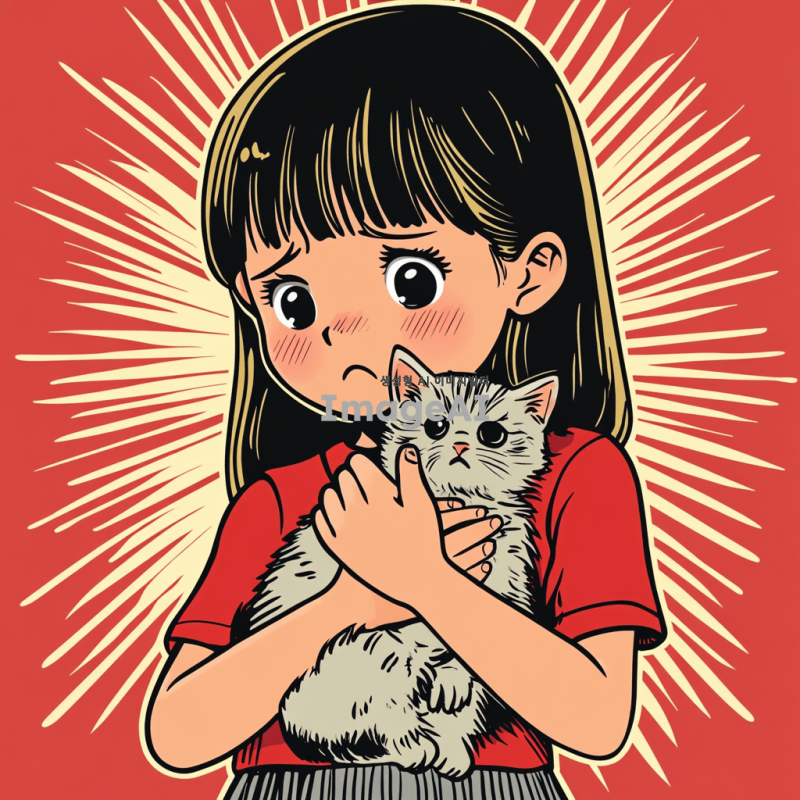 초등학교 한 여학생이 울면서 새끼 고양이를 품에 안고 있는 모습을 만화 형식으로 그려줘