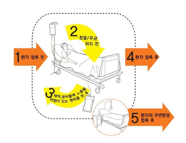환자가 침대에 누워있는 그림을 그려줘. 애니매이션 모드로 해줘. 이미지를 참고해서 손위생 시점을 모두 넣어줘.
