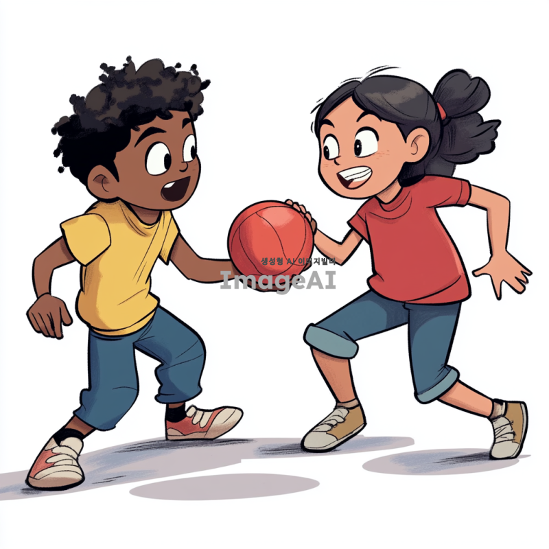 남자 아이가 피구를 하는데 의도적으로 여자 아이를 때려 맞히고 있는 모습을 만화로 그려줘. 둘 다 검은 머리의 아이들이야. 둘 다 외모가 훌륭한 점이 특징이야.