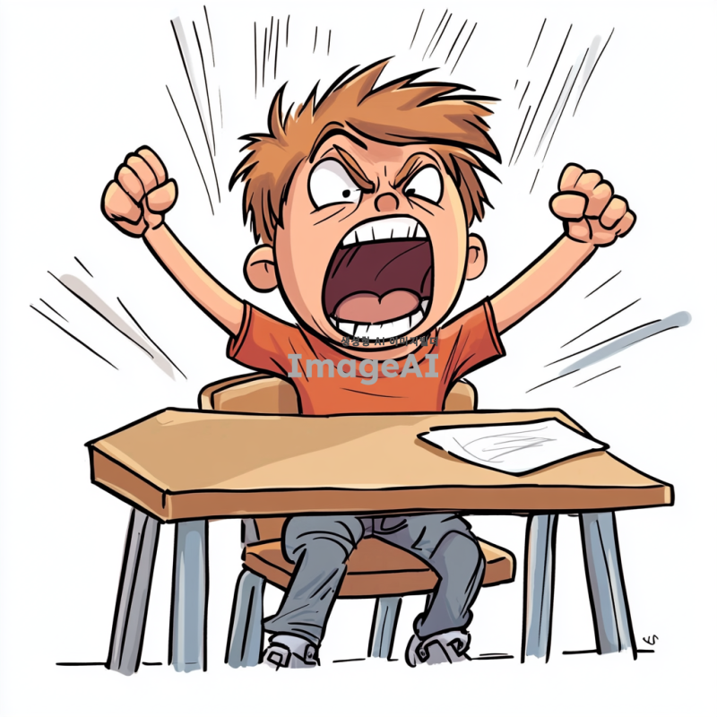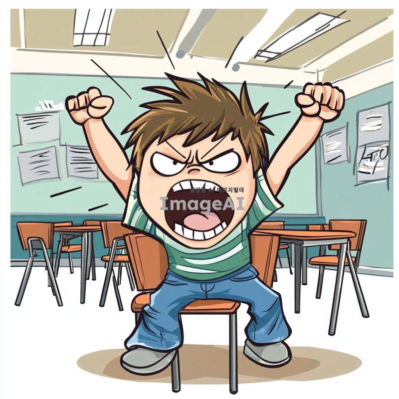 분노에 찬 한 남자 아이가 학교 교실에서 의자를 높이 집어 들고 포효하고 있는 모습을 만화 형식으로 그려줘.
