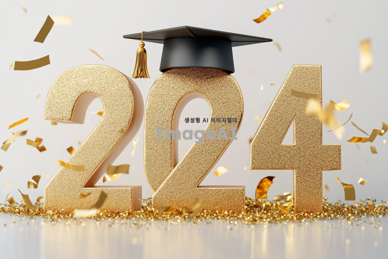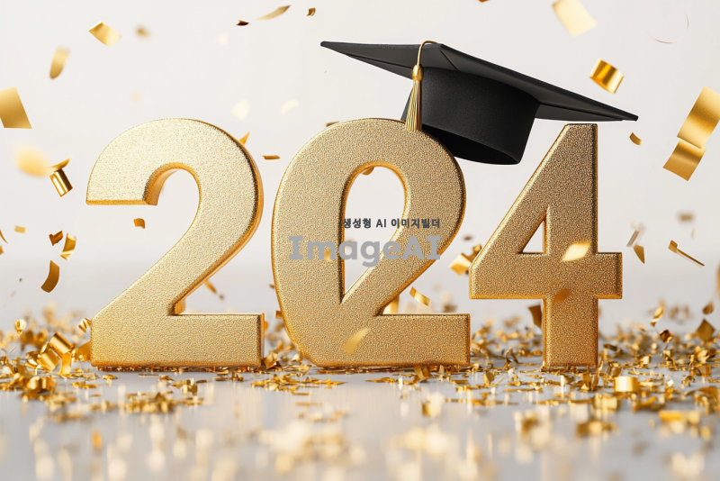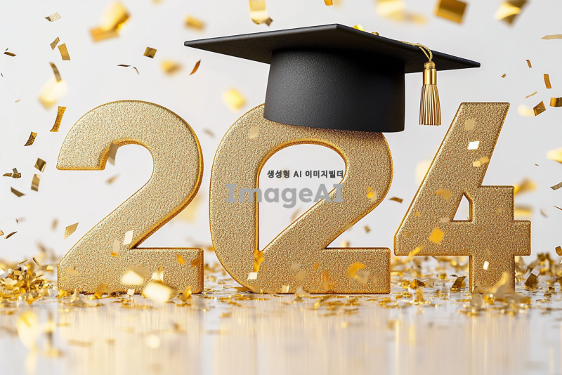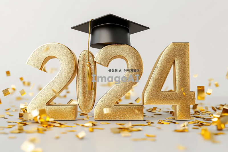 2024 숫자를 금으로 크게 디자인하고, 숫자 위에 학사모를 얹어 포인트를 줍니다. 배경은 깨끗한 흰색으로 설정하고, 금색 꽃가루가 날리는 장면을 추가하여 축제 분위기를 강조합니다.