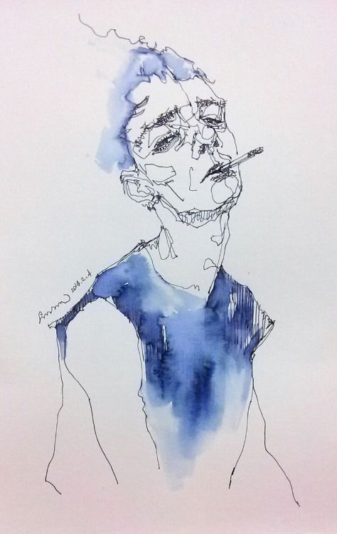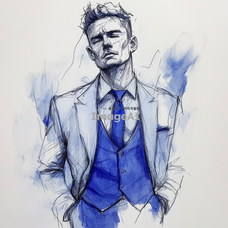 이 사진 이미지를 컨투어링 기법으로 선이 많이 사용된 것 처럼 러프하게 연필로 만든 것 처럼 해 주세요 색상은 딥한 블루를 간간히 포인트에 넣어주시구요 옷은 약간 정장처럼 깔끔하게 만들어주세요