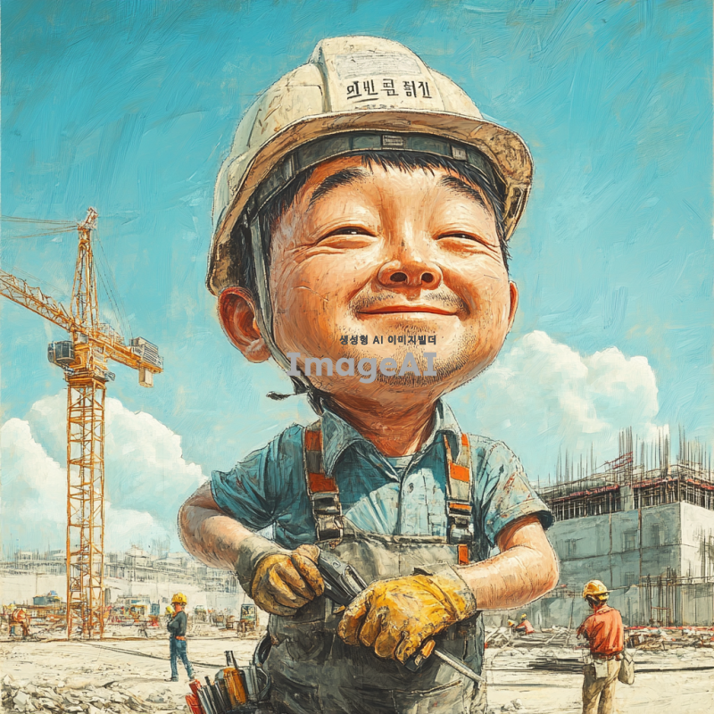 한국의 건설 현장에서 일하는 건설노동자의 캐리커쳐 안전모와 작업복을 착용하고 있으며, 배경에는 철근콘크리트 건설되고 있는 모습이 보인다. 노동자는 햇빛 아래에서 작업 도구를 사용하며, 땀을 흘리고 있는 모습이 자연스럽게 표현된다. 주변에는 다른 노동자들이 함께 작업하는 모습도 포함되어 있으며, 현장의 활기찬 분위기가 잘 드러난다.