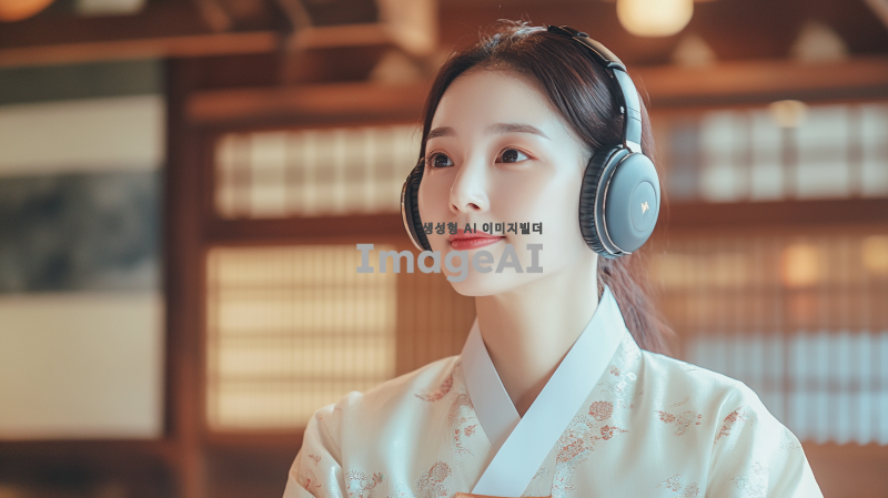 한복을 입고 있는 한국인 여성이 헤드셋을 쓰고 있는 모습, 전통적인 한복의 아름다움과 현대적인 헤드셋이 조화를 이루는 장면, 배경은 은은한 한국 전통 문양이 있는 실내 공간, 여성의 표정은 편안하고 집중된 모습, 자연스러운 조명과 부드러운 색감.