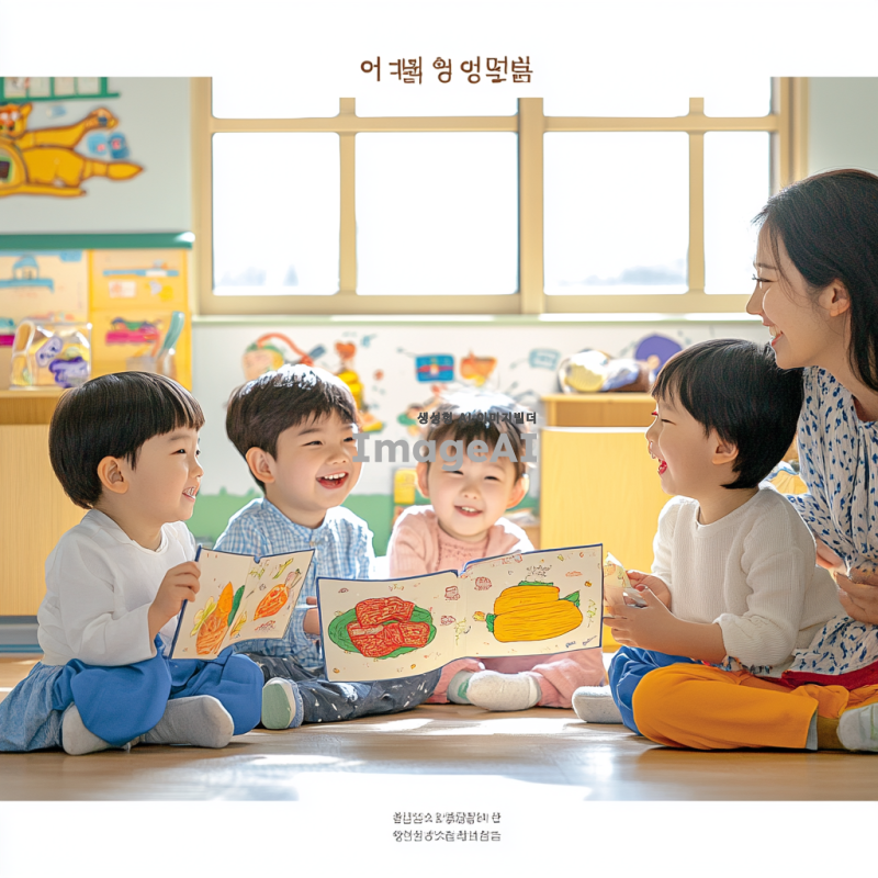 밝고 아늑한 유치원 교실에서 유치원생 3명이 바닥에 앉아 있습니다. 아이들은 웃고 있으며, 각자 손에 작은 김치수첩 모양의 책을 들고 있습니다. 교사는 따뜻한 미소를 지으며 아이들 앞에서 책을 읽어주고 있습니다. 교실 벽에는 알록달록한 그림과 장식이 걸려 있고, 창문으로 햇살이 부드럽게 들어옵니다. 아이들은 다양한 표정을 짓고 있으며, 책의 내용에 집중하고 있는 모습입니다. 교사의 옷은 밝고 친근한 색상이며, 아이들의 옷은 다양한 색상과 패턴으로 표현되어 있습니다.