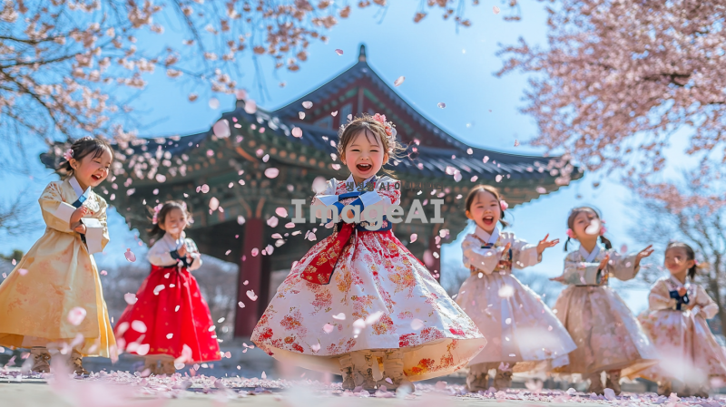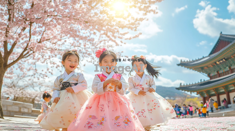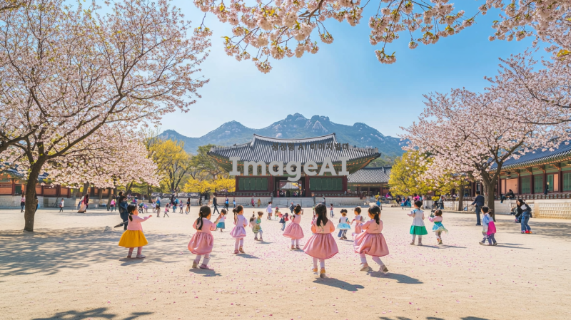 경복궁의 아름다운 전경 속에서 전통 한복을 입고 즐겁게 뛰노는 아이들, 따스한 봄 햇살이 비추는 푸른 하늘과 만개한 벚꽃 나무들, 아이들의 환한 웃음소리와 함께 전통 건축물의 정교한 디테일이 어우러진 장면, 부드러운 바람에 살랑이는 꽃잎들과 생기 넘치는 봄날의 분위기.