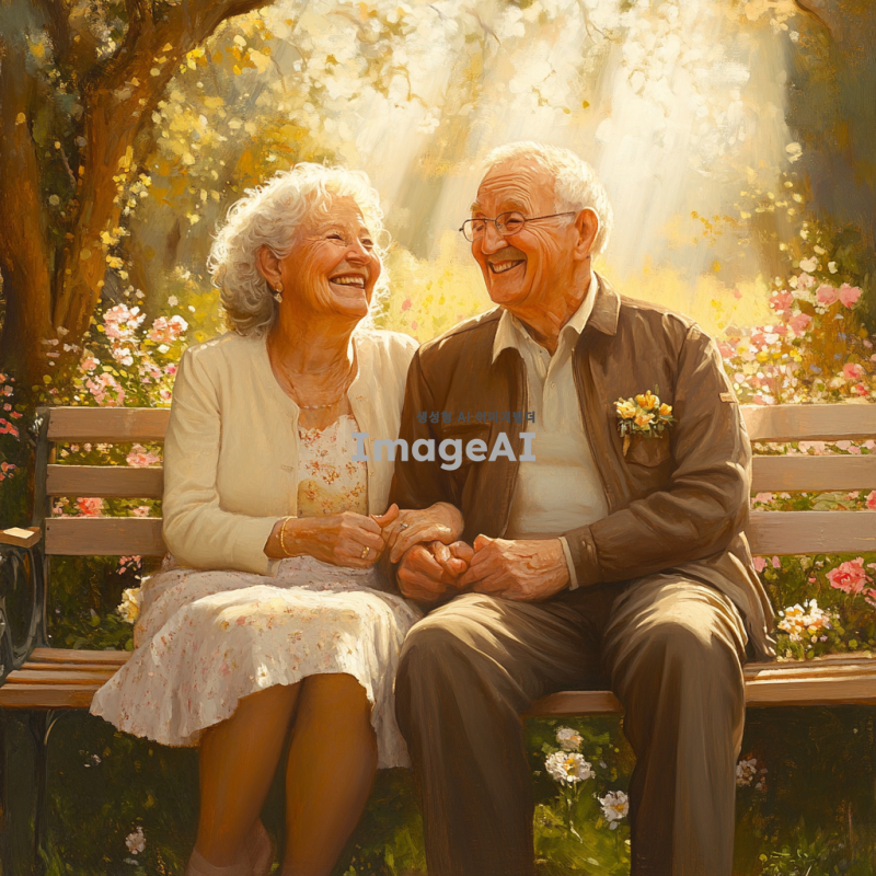 노부부가 함께 웃으며 공원 벤치에 앉아 있는 모습, 주변에는 꽃과 나무가 가득하고 따뜻한 햇살이 비치는 장면, 노부부는 서로 손을 잡고 있으며 편안하고 행복한 표정을 짓고 있음, 부드러운 파스텔 톤의 색감과 자연스러운 분위기, 노부부의 옷차림은 깔끔하고 단정한 캐주얼 스타일