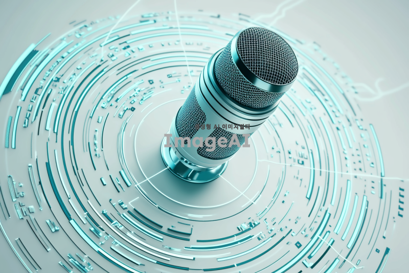 마이크와 스피커 아이콘이 결합된 형태, 텍스트가 음파로 변환되는 모습을 상징적으로 표현, 파란색과 흰색을 주된 색상으로 사용, 심플하고 직관적인 디자인, 현대적이고 깔끔한 스타일, 디지털 기술을 연상시키는 요소 포함, 원형 배경에 배치.