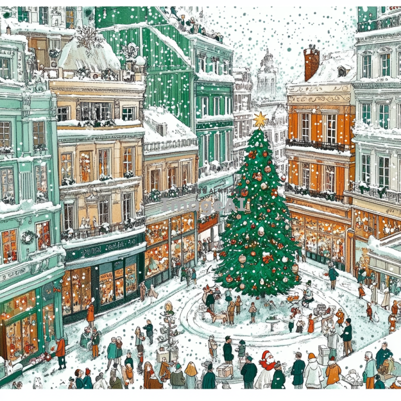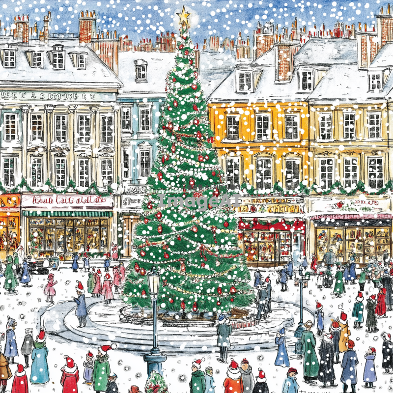 크리스마스 장식으로 화려하게 꾸며진 광장, 눈이 펑펑 쏟아지는 겨울 풍경, 반짝이는 크리스마스 트리와 다양한 색상의 전구들, 따뜻한 분위기의 사람들, 모두가 즐겁게 웃으며 산타 모자와 목도리를 두른 모습, 주변에 눈으로 덮인 나무들과 크리스마스 장식이 가득한 상점들, 부드럽게 내리는 눈송이들이 광장 전체를 덮고 있는 장면.