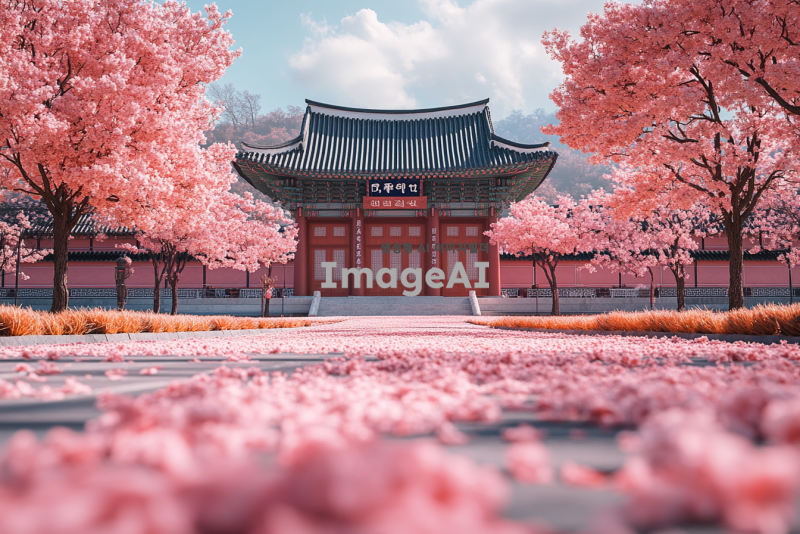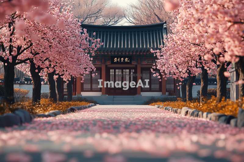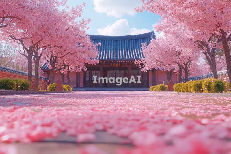 한국의 전통적인 학교 건물을 배경으로, 벚꽃잎이 바람에 날리는 장면. 밝고 환영하는 분위기의 입학식 날을 표현하며, 맑은 하늘 아래에 따뜻한 햇살이 비추는 모습. 학교 앞에는 다양한 크기의 나무들이 서 있고, 벚꽃이 만개하여 화사한 느낌을 준다.