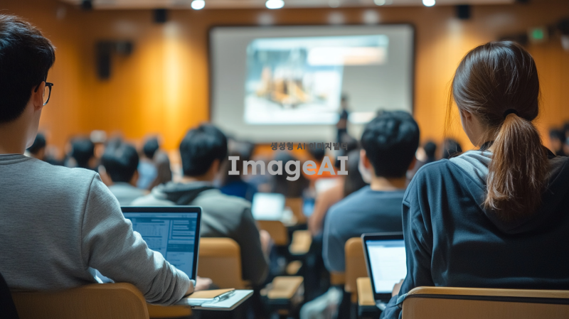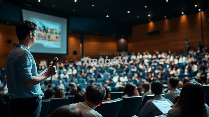 현대적인 대형 강당에서 여러 사람들이 모여 있는 모습, 무대 위에서 건설 관련 강연을 진행하는 전문가, 청중은 다양한 연령대의 한국인, 강연자는 마이크를 들고 있으며 배경에는 건설 프로젝트와 관련된 이미지나 슬라이드가 보임, 청중은 집중하여 강연을 듣고 있으며 노트북이나 노트를 사용하여 메모하는 모습, 실내 조명은 밝고 따뜻한 분위기, 강연의 전문성과 열정이 느껴지는 장면.