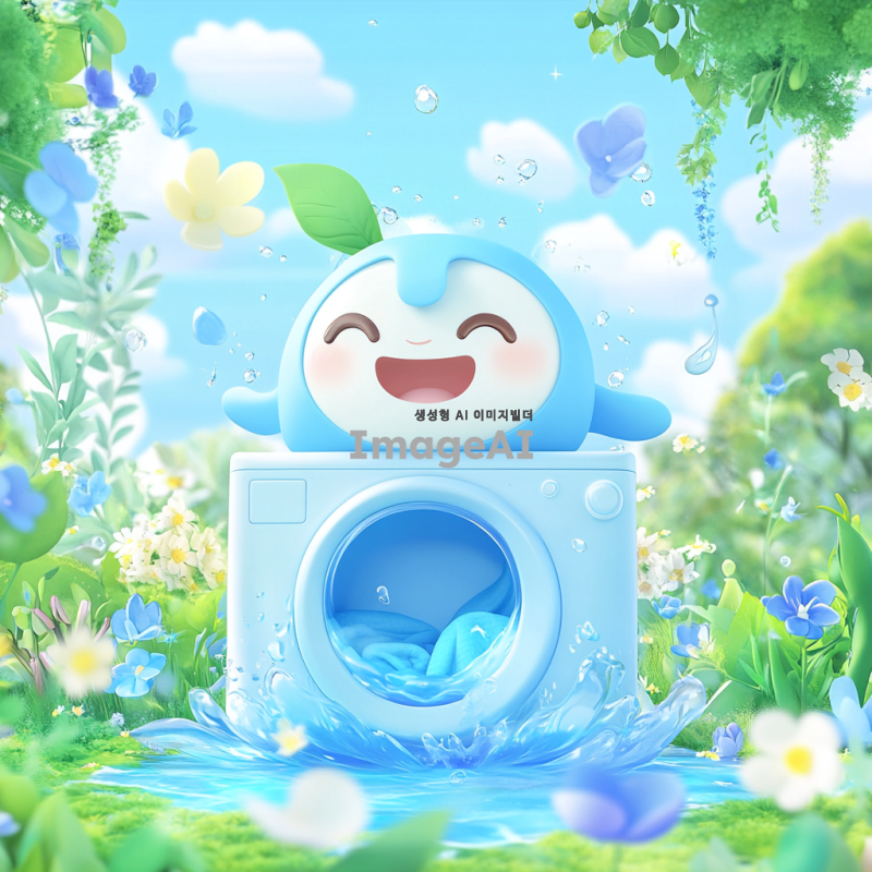 밝고 친근한 느낌의 세탁세제 캐릭터, 깨끗하고 상쾌한 이미지를 강조, 밝은 미소와 반짝이는 눈을 가진 귀여운 캐릭터, 세탁기나 빨래와 함께 있는 장면, 파란색과 흰색을 주요 색상으로 사용, 자연 속에서 상쾌한 바람을 맞으며 웃고 있는 모습, 친환경적인 이미지를 강조, 주변에 꽃이나 나무가 있는 배경, 부드럽고 둥근 형태의 디자인