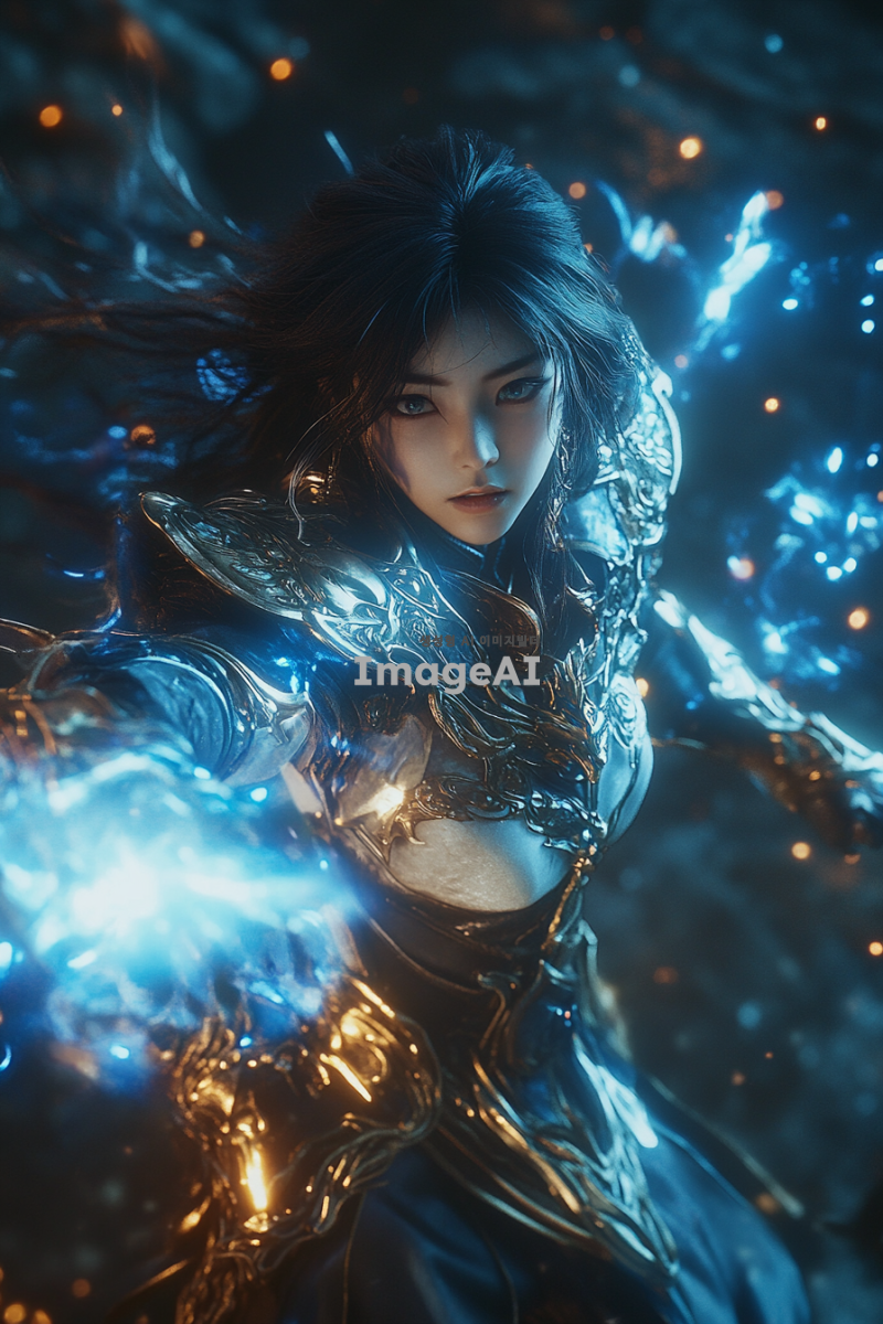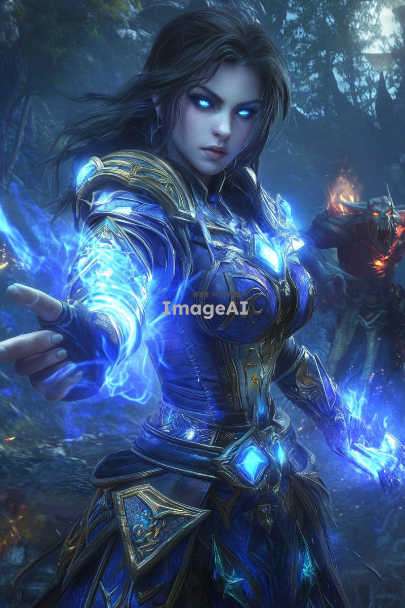 판타지 스타일의 전투 장면에서 강력한 전사로 변신한 카이사, 그녀는 화려한 갑옷을 입고 있으며, 주변에는 푸른 에너지가 감돌고 있다. 배경은 어두운 숲 속으로, 카이사가 빛을 발하며 적들과 대치하고 있는 모습. 카이사의 표정은 결의에 차 있으며, 그녀의 손에는 빛나는 무기가 들려 있다. 전체적으로 역동적이고 긴장감 넘치는 분위기를 강조.