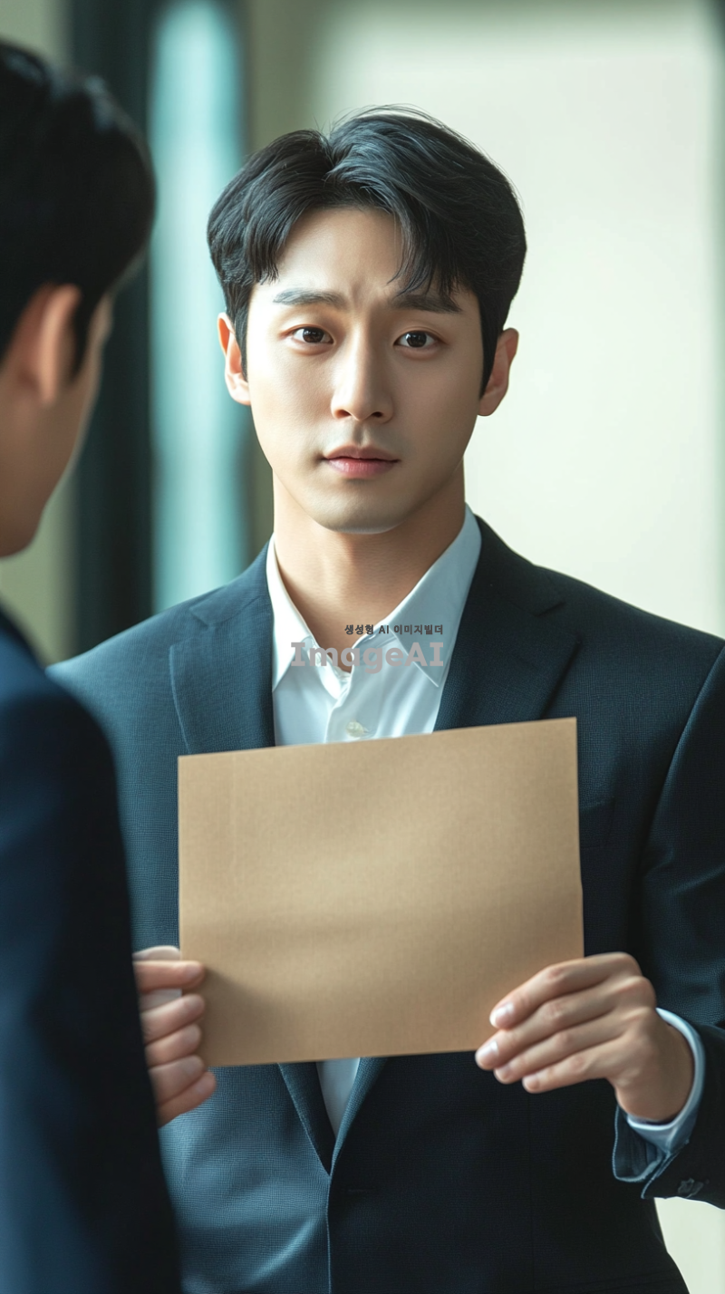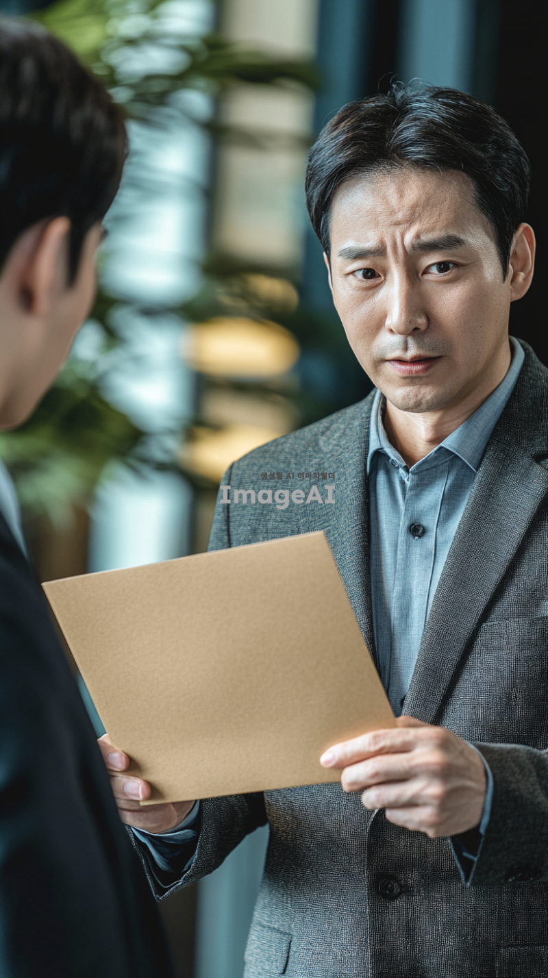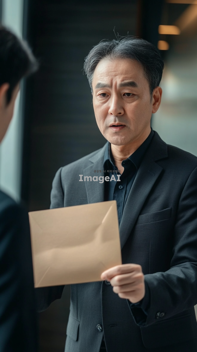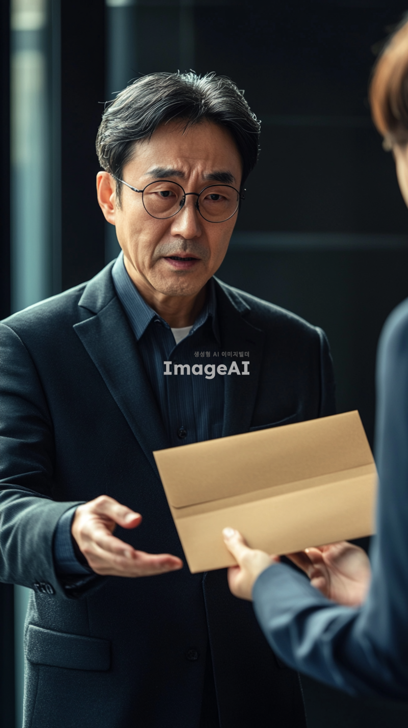 중년의 한국인이 젊은 한국인 직원에게 갈색 봉투를 건네고 있다. 남성은 약간 놀란 표정을 짓고 있으며, 직원은 정장 차림으로 깔끔하게 입고 있으며, 조명은 자연스럽고 부드럽게 설정되어 있다.