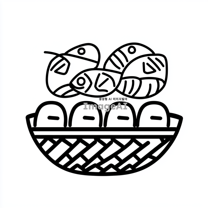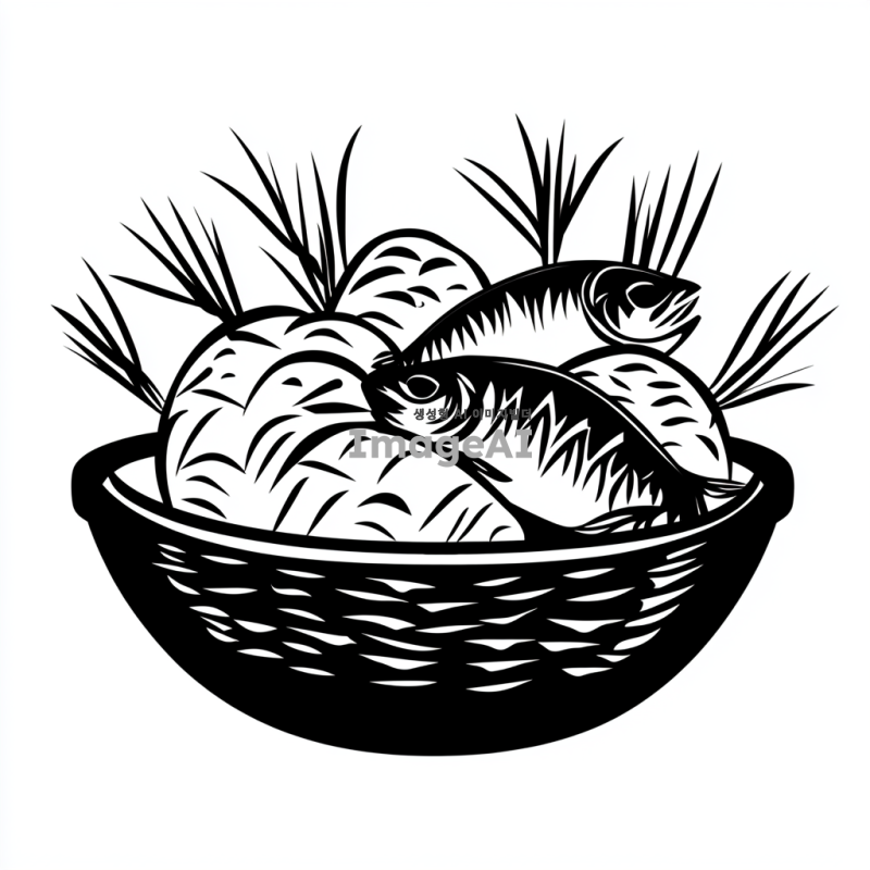 짚으로 엮은 광주리 안에 구운 생선 두 마리와 빵 다섯 덩이가 담긴 심플한 로고 형태의 흑백 라인 아트 이미지, 한국 전통 느낌.