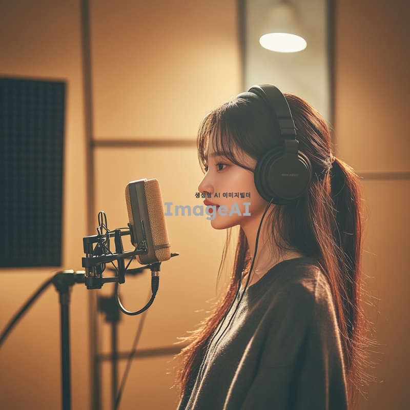 한국 여성, 학원 스튜디오에서 녹음 중, 헤드폰을 착용하고 마이크 앞에 서 있는 모습, 집중한 표정, 주변에 다양한 녹음 장비와 음향 패널, 따뜻한 조명, 현대적인 스튜디오 인테리어, 음악적 분위기.