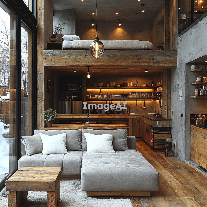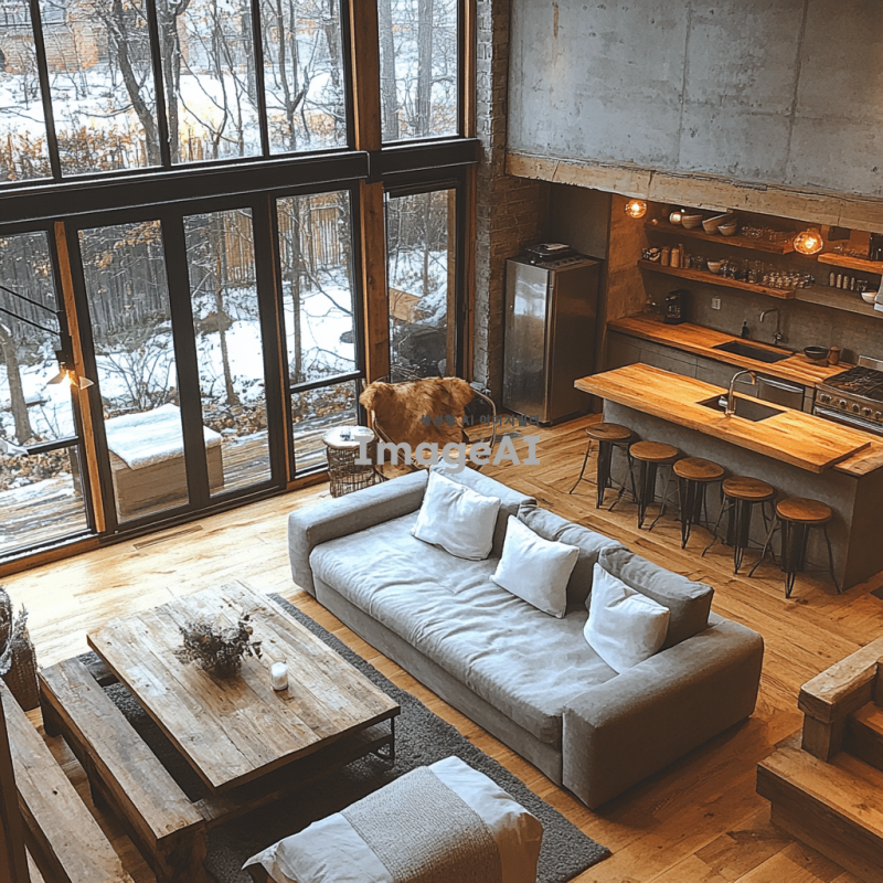 회색 톤의 개방형 거실과 주방 사진으로, 현대 산업 스타일입니다. 공간은 나무 바닥, 흰색 베개가 있는 아늑한 소파, 왼쪽에 시골풍의 나무 테이블, 오른쪽 구석에 바 카운터, 부드러운 회색 패브릭 커버링이 있는 더블 침대를 특징으로 합니다. 큰 창문에서 들어오는 자연광과 따뜻한 조명이 방을 채우며, 항공 뷰를 제공합니다. 밖은 눈이 내리고 있으며 실내에는 밖과 대조되게 따뜻한 느낌을 줍니다
