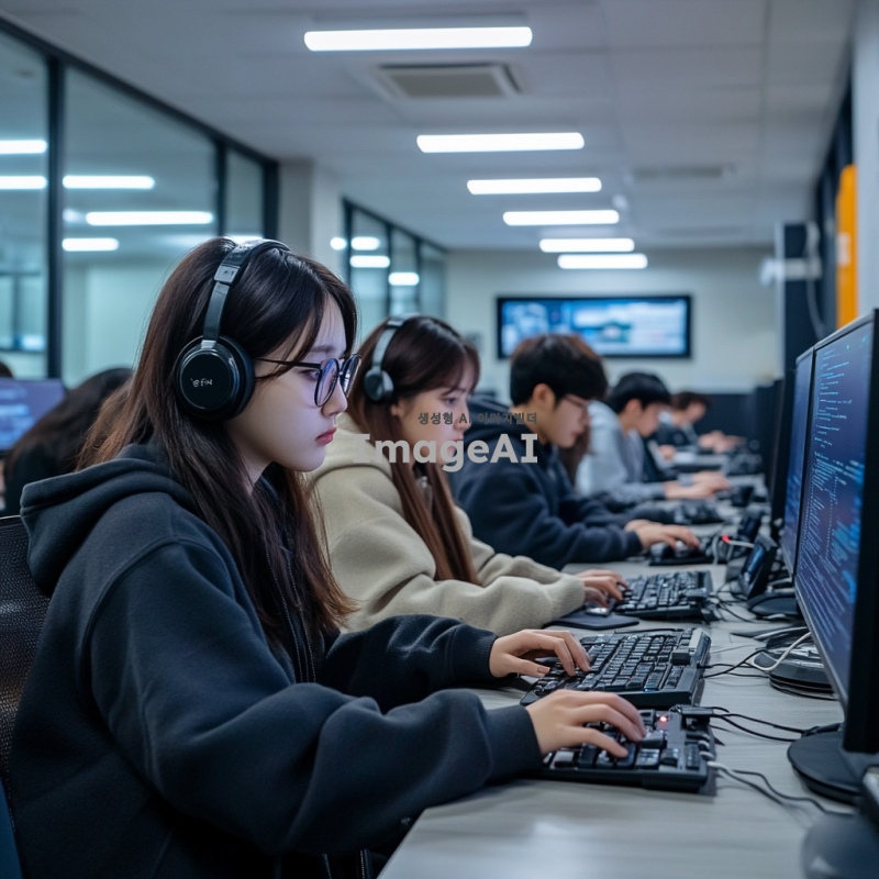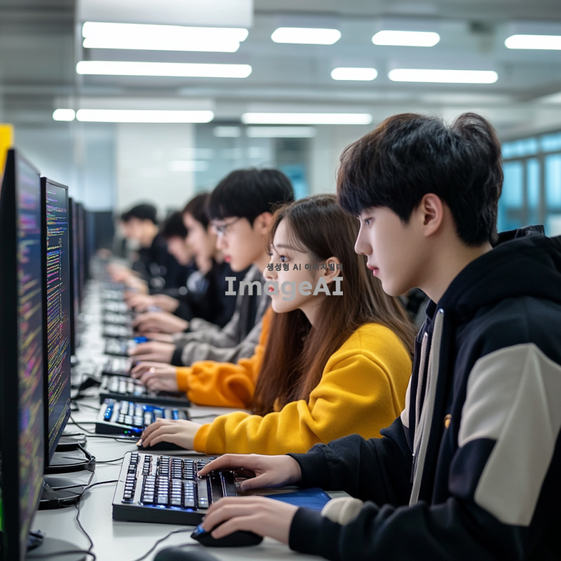 현대적인 교실에서 가상 키보드를 사용하여 해킹 기술을 배우는 학생들, 학생들은 집중하여 컴퓨터 화면을 바라보며 가상 키보드를 사용하고 있고, 주변에는 첨단 기술 장비와 디지털 화면이 가득한 모습, 학생들은 다양한 연령대의 한국인으로 구성되어 있으며, 각자의 스타일로 편안한 옷을 입고 있음, 교실은 밝고 미래지향적인 분위기를 가지고 있음.
