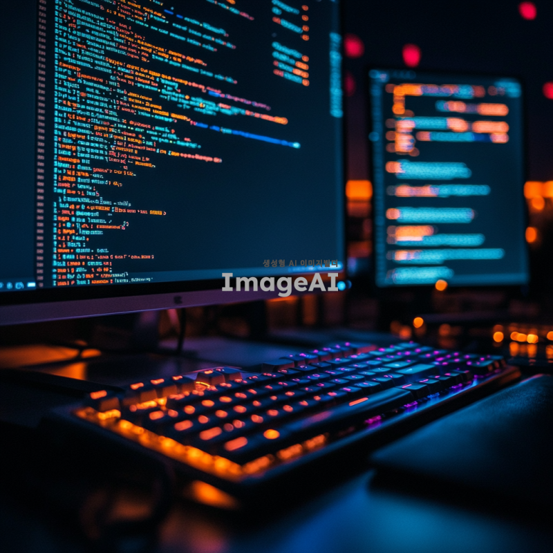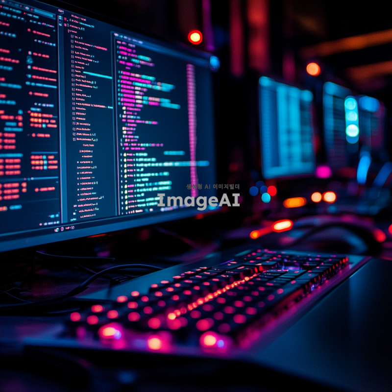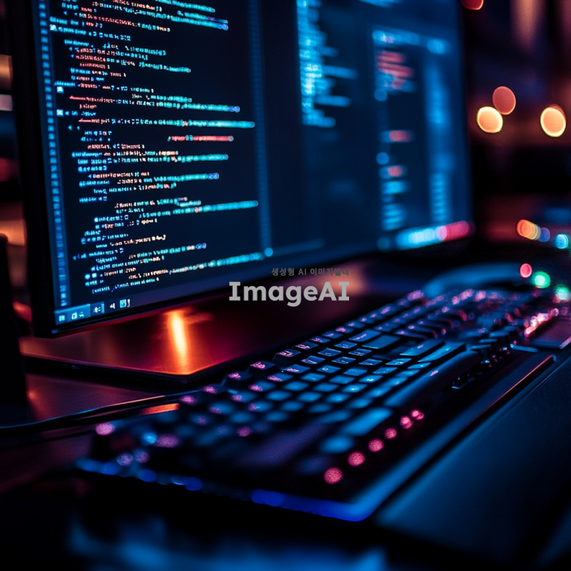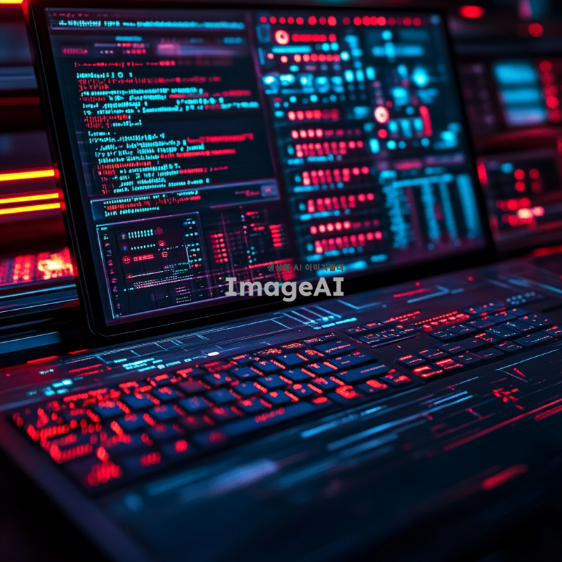 최첨단 해킹 장비와 한국인이 사용하는 키보드가 함께 놓여 있는 모습, 어두운 배경에 조명이 장비와 키보드를 강조하며 빛나고 있는 장면, 장비에는 복잡한 코드와 디지털 신호가 흐르고 있는 디스플레이, 키보드는 깔끔하고 현대적인 디자인, 전체적으로 미래적이고 기술적인 분위기.