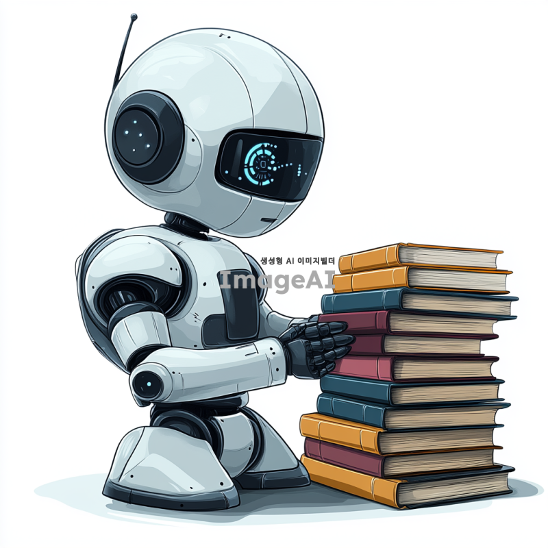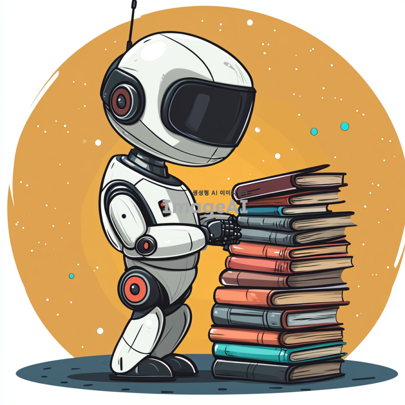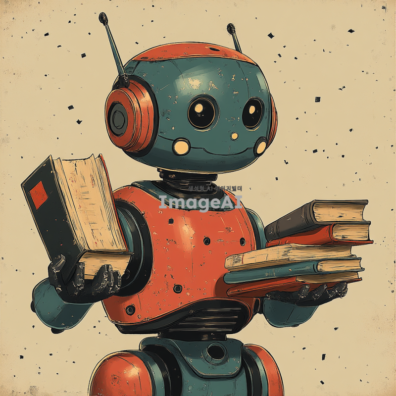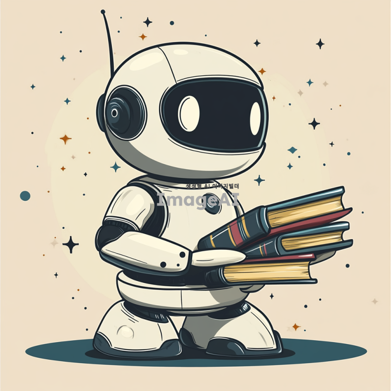 픽토그램 스타일의 로봇이 중앙에 위치하고 있으며, 로봇은 인간형태가 아닌 기계적인 디자인으로 책을 서빙하고 있는 모습. 로봇의 팔에는 여러 권의 책이 쌓여 있고, 배경은 단순한 색상으로 설정하여 로봇이 돋보이도록 구성. 로봇의 외형은 매끄럽고 현대적인 디자인을 반영하며, 책은 다양한 크기와 색상으로 표현.