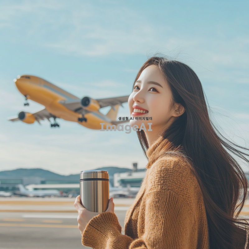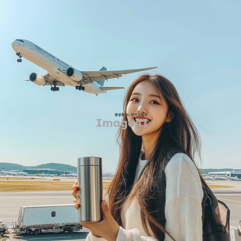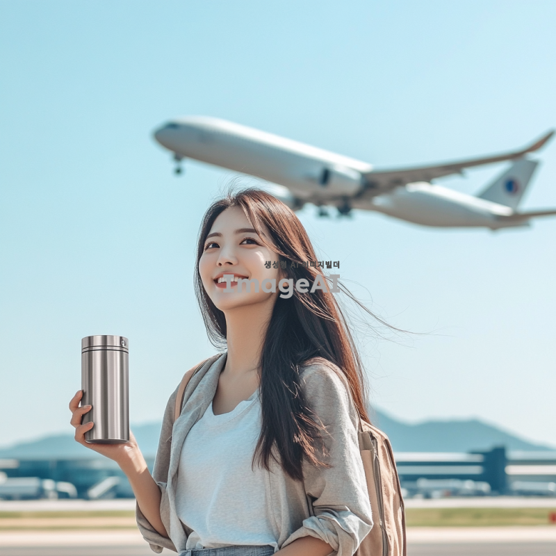 공항 활주로 근처에서 비행기가 이륙하는 장면을 배경으로, 손에 텀블러를 들고 있는 젊은 한국인 여성이 서 있다. 그녀는 캐주얼한 옷차림으로, 공항의 활기찬 분위기를 느끼며 미소를 짓고 있다. 하늘은 맑고 푸르며, 비행기는 힘차게 날아오르고 있다. 여자의 긴 머리는 바람에 살짝 흩날리고, 텀블러는 반짝이는 금속 재질로 고급스러움을 더한다. 주변에는 공항의 다양한 시설물들이 보이며, 현대적인 느낌을 준다.