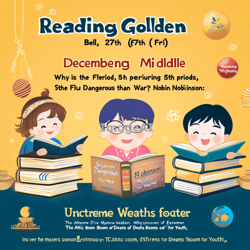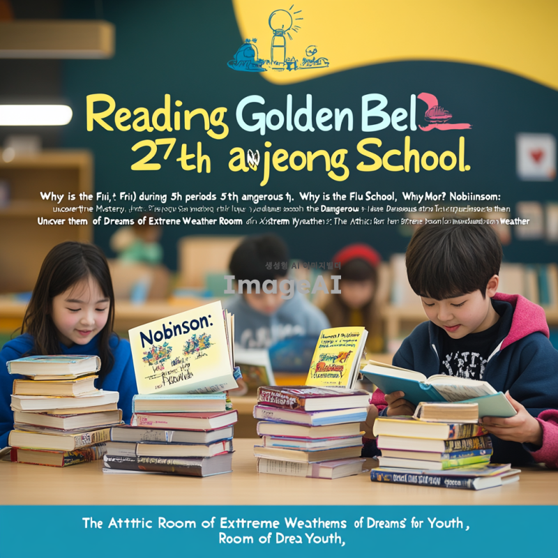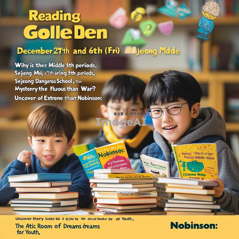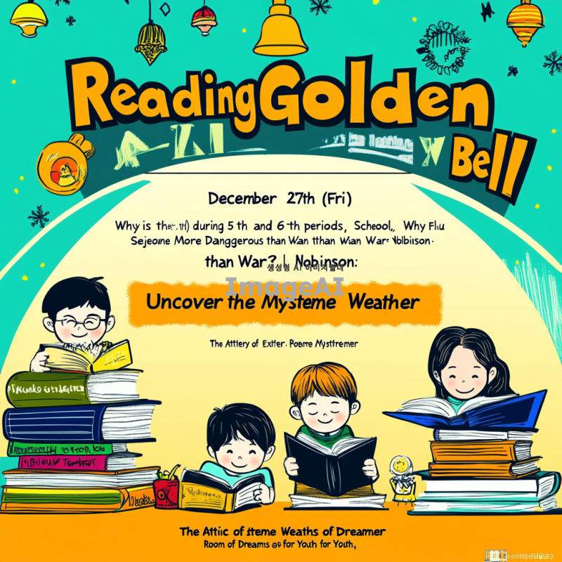 독서골든벨을 알리는 프랑카드 디자인: 밝고 활기찬 분위기의 배경, 책을 읽는 학생들의 이미지, 책 더미와 독서 관련 아이콘들, "독서골든벨"이라는 큰 글씨, 행사 날짜 "12월 27일(금) 5,6교시", 장소 "세정중학교", 문제 기출도서 제목과 이미지: 1. "왜, 독감은 전쟁보다 독할까" 2. "노빈손 이상기후의 정체를 밝혀라" 3. "청소년 꿈꾸는 다락방", 독서와 지식의 중요성을 강조하는 문구, 밝은 색상과 친근한 디자인 요소 사용.