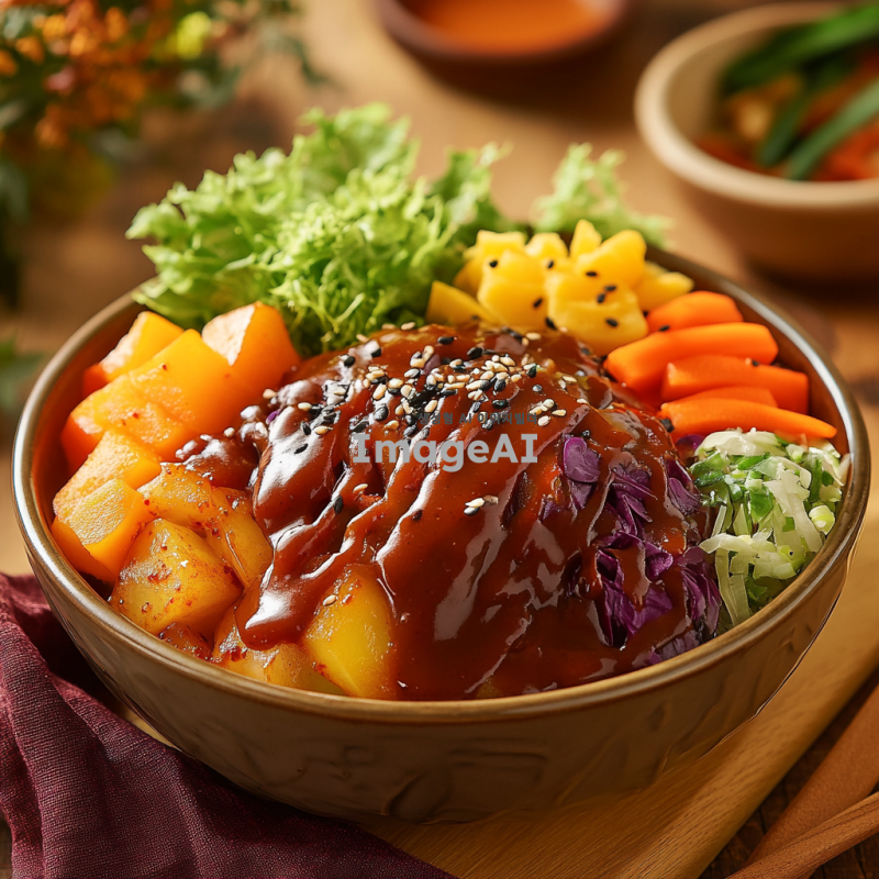 깊고 풍부한 밤호박 색감의 비빔밥 밀키트 이미지, 한국 전통의 도자기 그릇에 담긴 비빔밥, 으깬 밤호박과 된장이 어우러진 소스가 비빔밥 위에 골고루 뿌려져 있는 모습, 신선한 채소와 함께 다양한 색상의 나물들이 조화롭게 배치된 비빔밥, 따뜻한 느낌의 자연광 아래에서 촬영된 이미지, 전통적인 한국 식탁 분위기를 강조하는 배경.