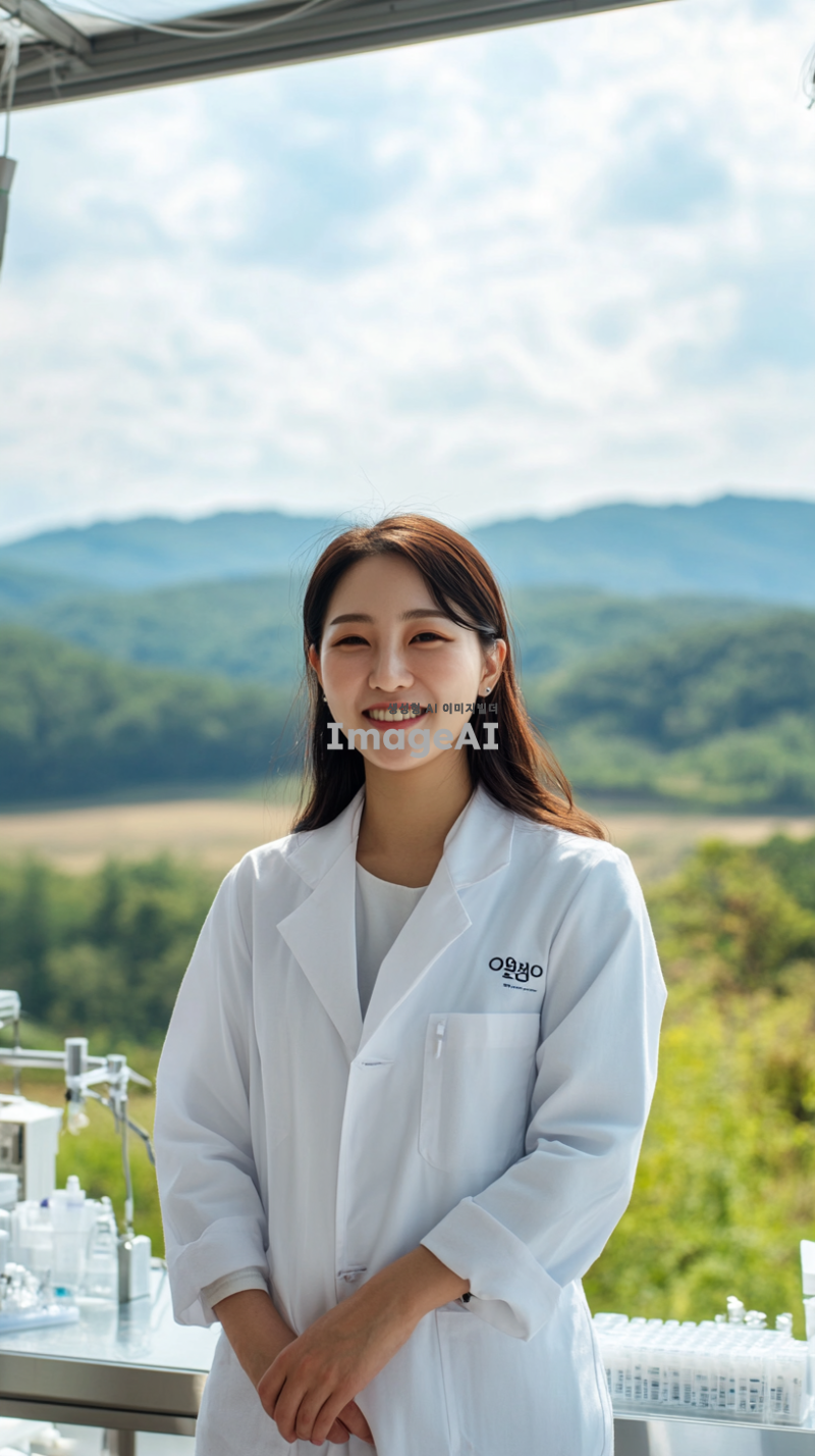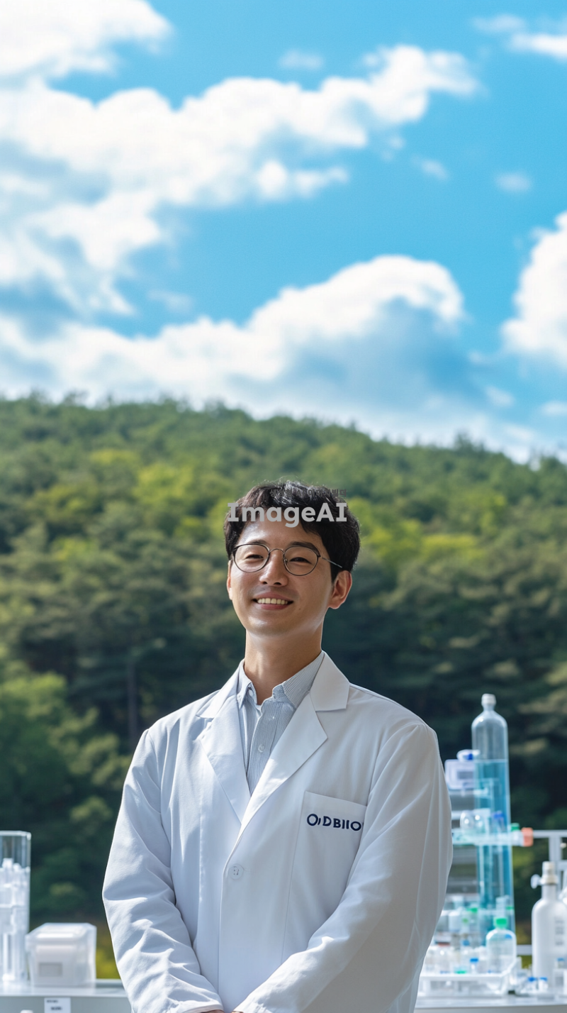 - 연구소 앞에 서 있는 한국인 과학자, 흰색 실험복을 입고 미소를 지으며 자연을 배경으로 서 있는 모습