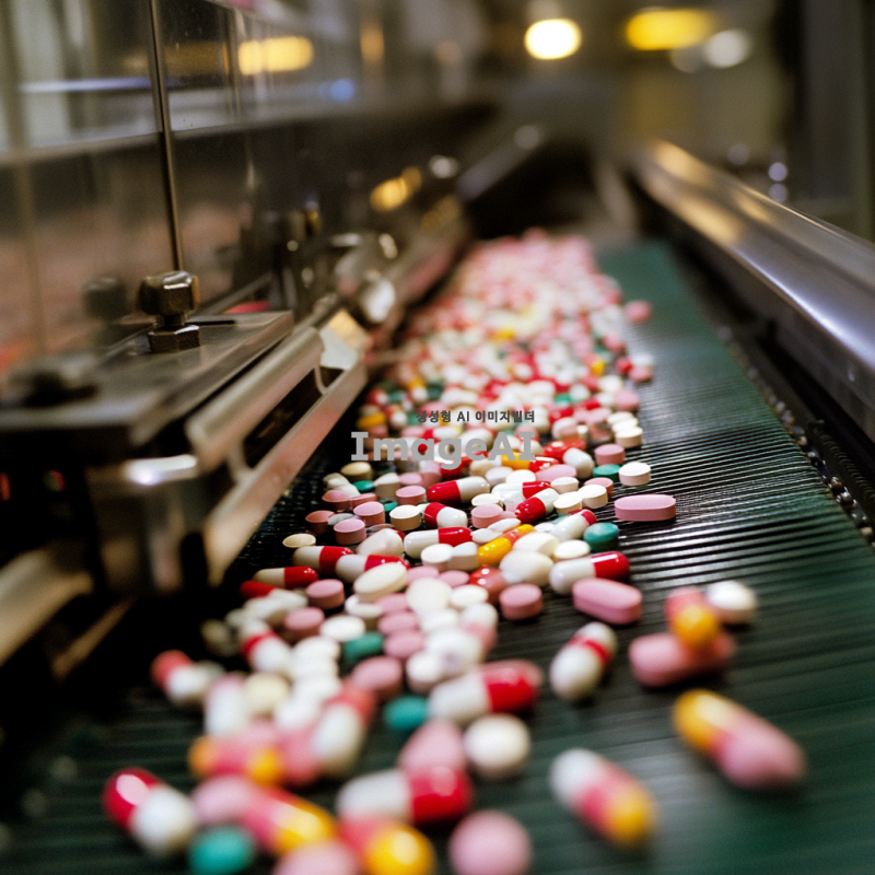 태블릿과 캡슐을 검사하는 공정에 관한 사진, 사람은 없음, 알약이나 캡슐약 자체에 대한 사진도 포함, 너무 척박한 컨베이어 벨트 모양은 아닌 현대적인 장비 사용