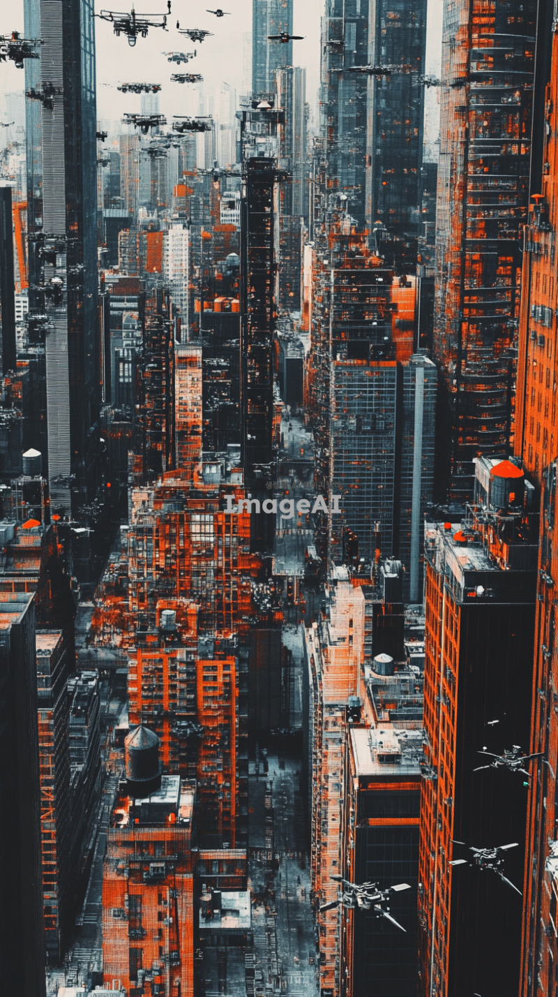 미래지향적인 기계공학적 요소가 돋보이는 도시 풍경, 고층 빌딩 사이로 복잡한 기계 구조물이 보이고, 하늘에는 드론이 날아다니며, 바닥에는 자동화된 로봇들이 움직이고 있는 모습, 전체적인 색조는 차가운 메탈릭 톤, 현대적인 디자인과 정교한 디테일 강조.