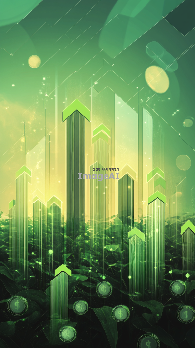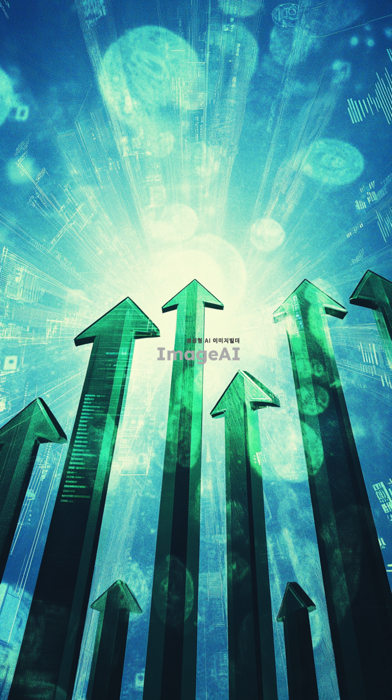 밝고 희망적인 분위기의 코인 차트, 차트가 끝없이 상승하며 하늘을 향해 치솟는 모습, 배경에는 커다란 녹색 화살표들이 상승하는 느낌을 강조하며 나타남, 차트의 선은 선명하고 굵게, 차트의 배경은 깨끗한 하늘색으로 설정, 차트는 디지털 스타일로 현대적이고 세련되게 표현, 주변에는 코인과 관련된 아이콘들이 부드럽게 배치되어 있으며, 전체적인 분위기는 긍정적이고 활기찬 느낌을 주도록 구성.