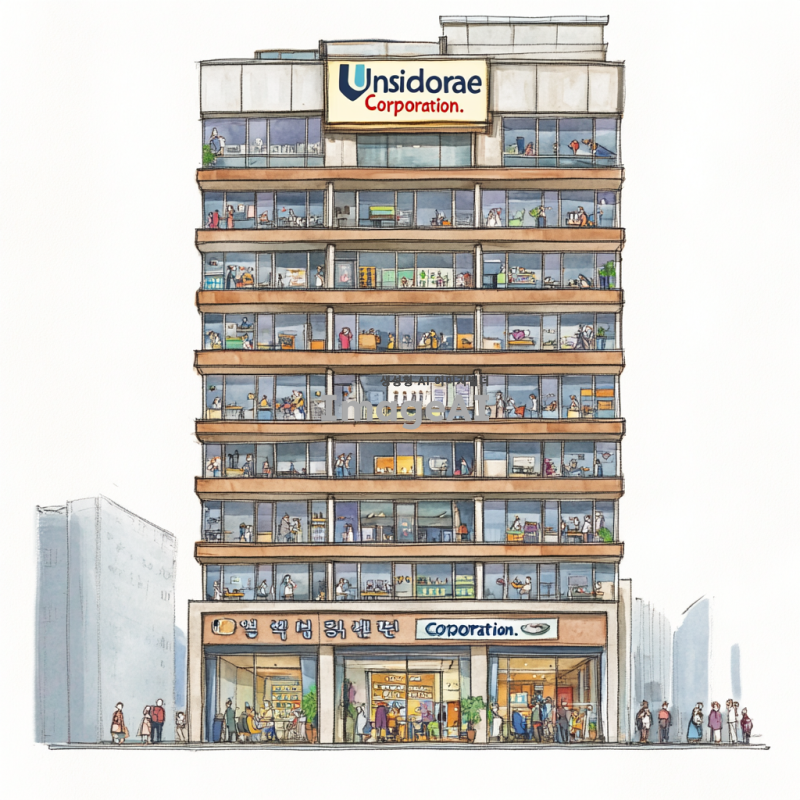 20층 건물의 전체적인 외관을 보여주는 그림. 건물 상단 20층에는 "운시도래 주식회사" 간판이 크게 걸려 있다. 17~19층은 공유오피스로, 창문에 공유오피스 느낌의 로고나 문구가 보인다. 15~16층은 일반 사무실로, 깔끔하고 정돈된 외관을 가진다. 13~14층은 고등학교 입시학원, 11~12층은 중학교 학원, 9~10층은 초등학교 학원으로, 각 층마다 학원의 특징적인 간판이 걸려 있다. 6~8층은 병원으로, 의료 관련 아이콘이나 십자가가 보인다. 5층은 브런치 카페로, 아늑하고 따뜻한 느낌의 간판이 있다. 4층은 식당가로, 다양한 음식점의 간판이 걸려 있다. 3층은 네일샵과 미용실 등의 뷰티 관련 상점들로, 화려하고 세련된 간판이 돋보인다. 2층은 은행으로, 안정적이고 신뢰감 있는 간판이 있다. 1층에는 스타벅스, 김밥집, 편의점이 위치해 있으며, 각 브랜드의 로고가 선명하게 보인다. 지하에는 줄넘기 학원과 스포츠 클라이밍 시설이 있으며, 운동 관련 이미지를 통해 활기찬 분위기를 연출한다. 건물 주변에는 사람들이 오가는 모습이 자연스럽게 그려져 있다.