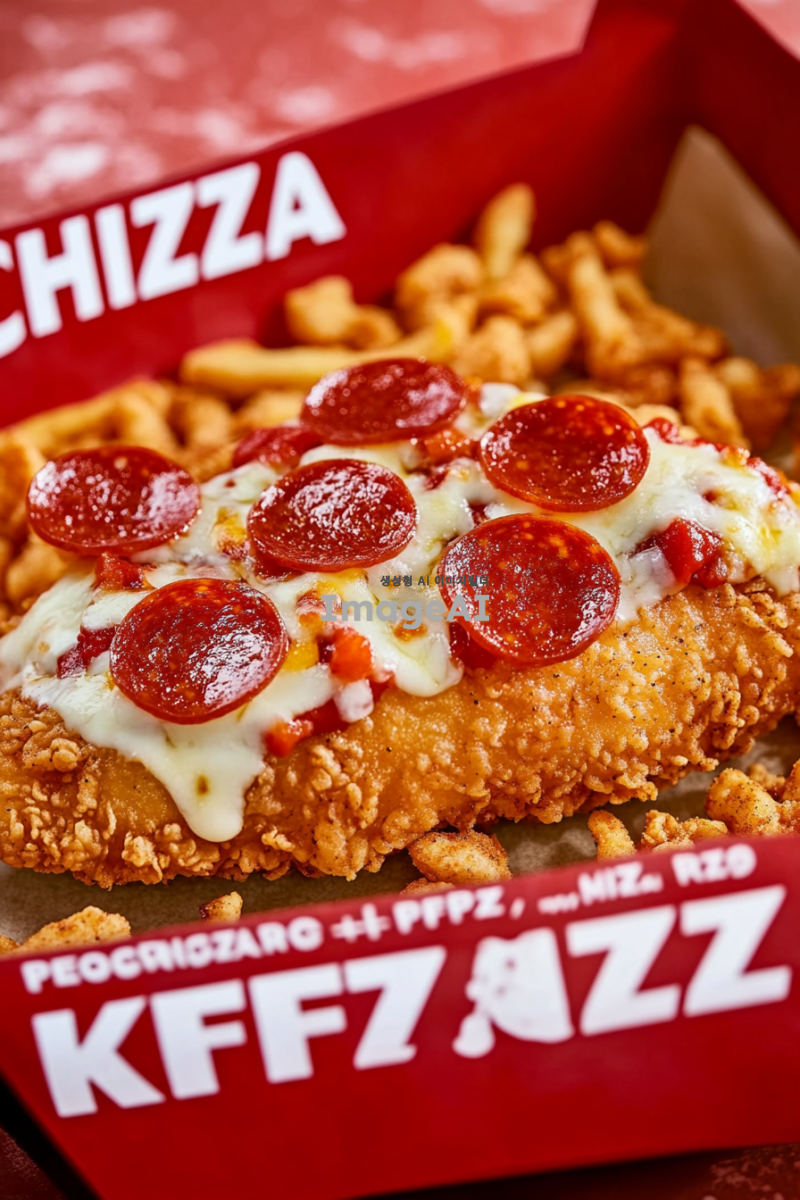 KFC 치킨필렛 위에 페퍼로니와 달콤한 양파, 아삭한 피망, 체다치즈, 모짜렐라 치즈가 올라간 제품 이미지 컷 + KFC 스러운 배경에 합성