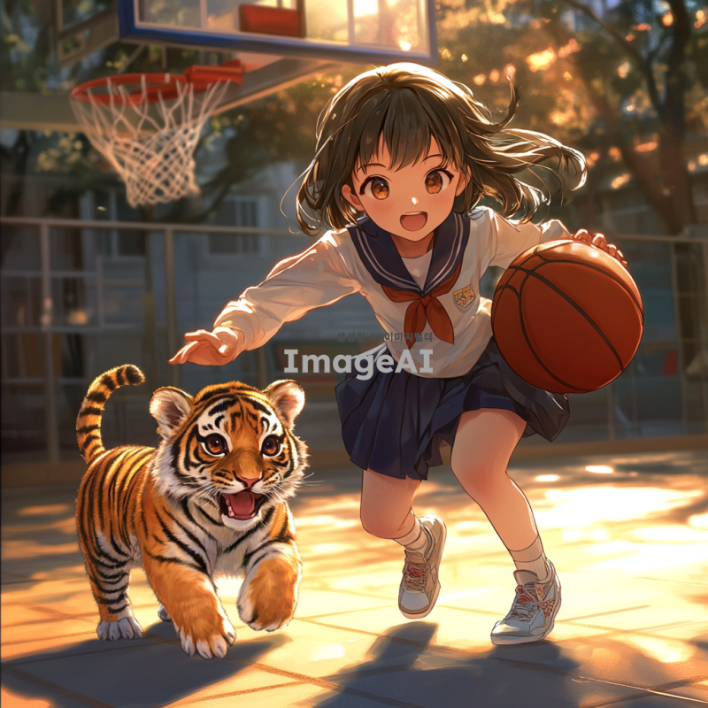 고급스러운 교복을 입은 한국인 소녀가 밝고 활기찬 표정으로 학교 운동장에서 농구를 하고 있는 모습, 소녀의 옆에는 귀여운 아기 호랑이가 함께 뛰어다니며 즐거워하는 장면, 소녀의 눈빛은 자신감과 독립심이 가득하며, 주변에는 따뜻한 햇살이 비추고 있는 배경.
