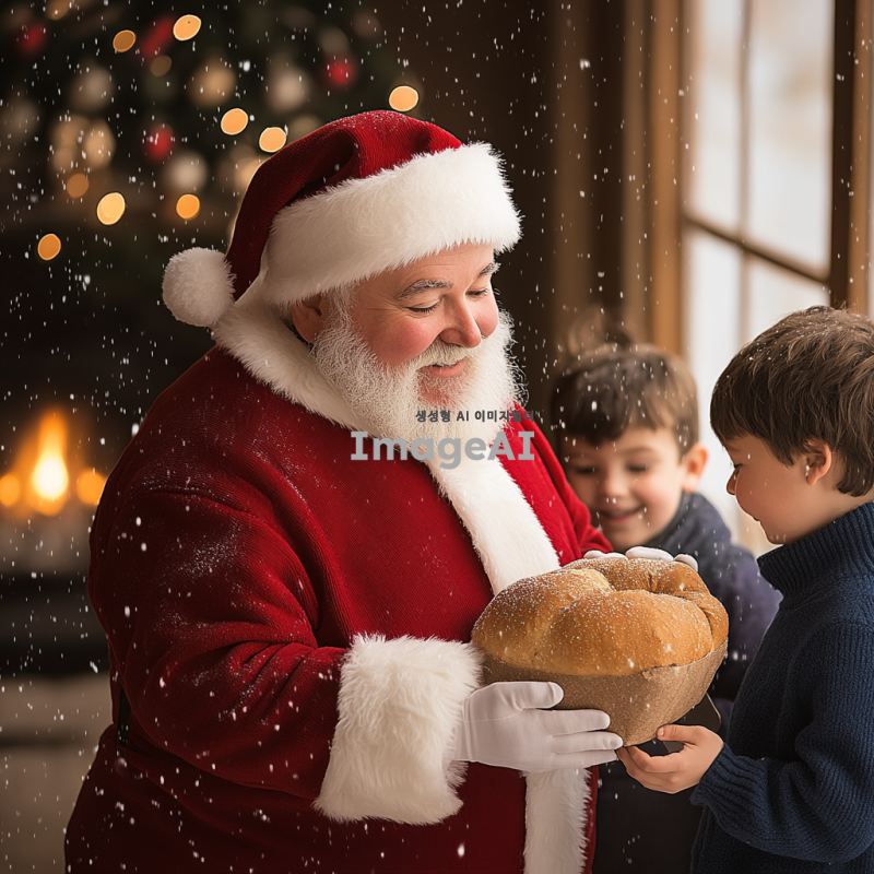 크리스마스 분위기의 따뜻한 거실에서 선물을 나눠주는 산타할아버지, 벽난로 옆에 놓인 크리스마스 트리와 반짝이는 장식들, 행복한 표정의 아이들이 산타할아버지 주위에 모여 있는 장면, 부드러운 눈이 창밖으로 내리는 겨울 풍경, 산타할아버지는 전통적인 붉은 옷과 흰 수염을 가진 모습.