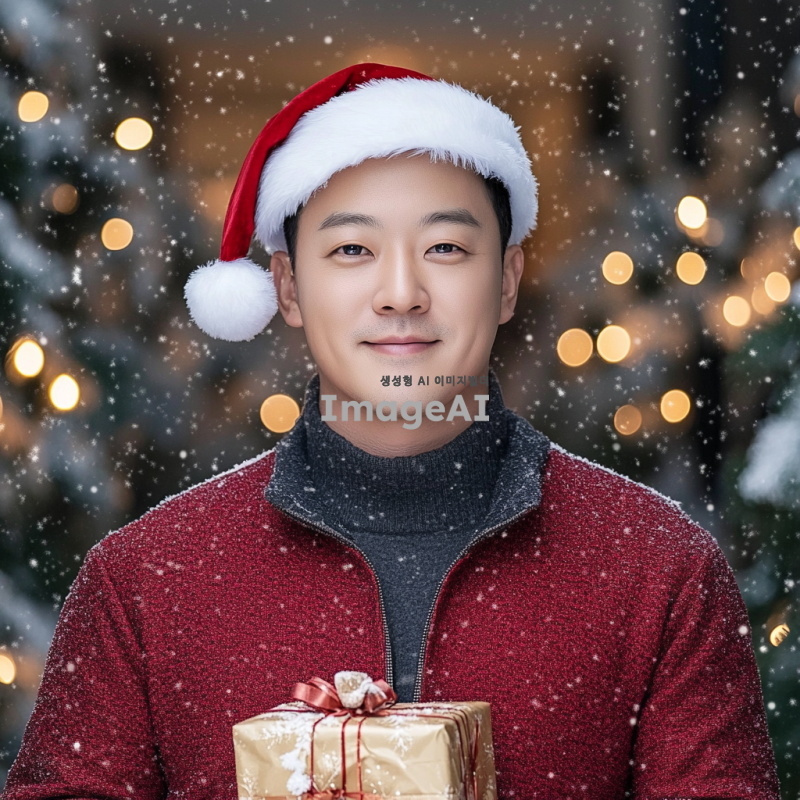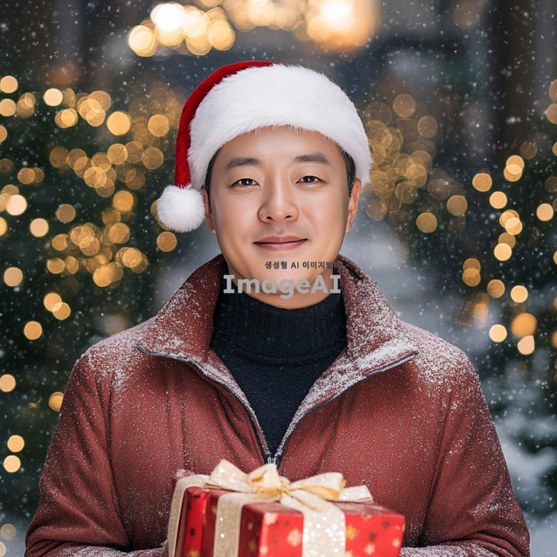 크리스마스 분위기의 배경에 산타 모자를 쓴 한국인 남성, 밝고 따뜻한 미소를 지으며 눈이 내리는 겨울 풍경 속에서 선물을 들고 있는 모습, 붉은색과 흰색의 전통적인 산타 의상을 입고 있으며 주변에는 크리스마스 트리와 반짝이는 조명들이 장식되어 있는 장면.