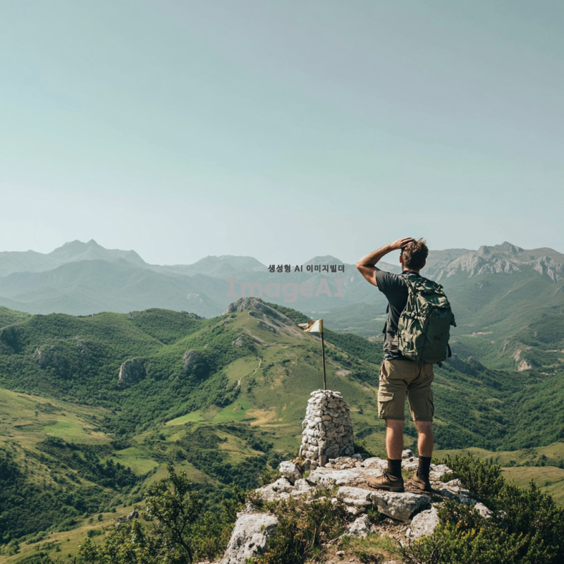 맑은 하늘 아래 산 정상에 서 있는 등산객 아저씨, 땀에 젖은 얼굴에 성취감이 가득하며, 등산복과 등산화를 착용하고 있고, 주변에는 푸른 산과 드넓은 풍경이 펼쳐져 있다. 아저씨는 손을 이마에 얹고 멀리 바라보며, 가벼운 바람에 머리카락이 흩날리고 있다. 산 정상에는 작은 돌탑과 깃발이 있으며, 자연의 웅장함을 느낄 수 있는 장면.