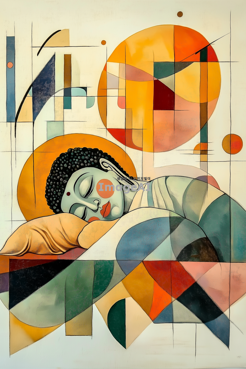 와불이 이불을 덮고 낮잠을 자고 있는 모습을 중심으로, 배경은 삼각형, 사각형, 기다란 선 등의 단순한 도형들이 조화롭게 떠다니는 추상 이미지. 도형들은 전체적으로 균형을 이루며, 녹색과 핑크색과 파란색 계열의 색상을 사용하여 표현. 녹색은 밝은 색이지만 채도가 낮은 색. 파란색은 울트라마린 색. 핑크색은 형광빛이 나는 색으로. 부드럽고 조형적인 추상 배경이 강조된 이미지. 칸딘스키의 추상작업을 참고하여. 와불과 이불은 사실적인 묘사로 표현하고 뒷배경인 추상작업은 단순한 이미지로. 이불을 덮고 있는 와불이 그림의 주제이지만 화면의 상단에 위치.