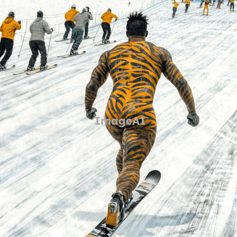 구릿빛 피부의 근육질 남성이 얼룩말 무늬 옷을 입고 스키장에서 빠르게 내려가고 있다. 그의 뒷모습이 보이며, 스키를 타는 모습이 역동적이다. 배경에는 노란색과 회색이 섞인 자켓을 입은 남성들이 그를 쫓고 있으며, 그들의 모습이 긴박하게 표현된다. 주변은 하얀 눈으로 덮인 스키장의 풍경이 펼쳐져 있다.
