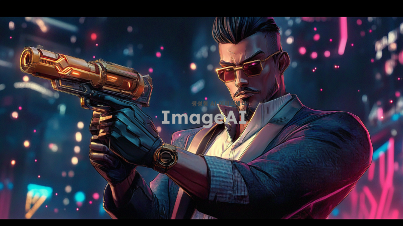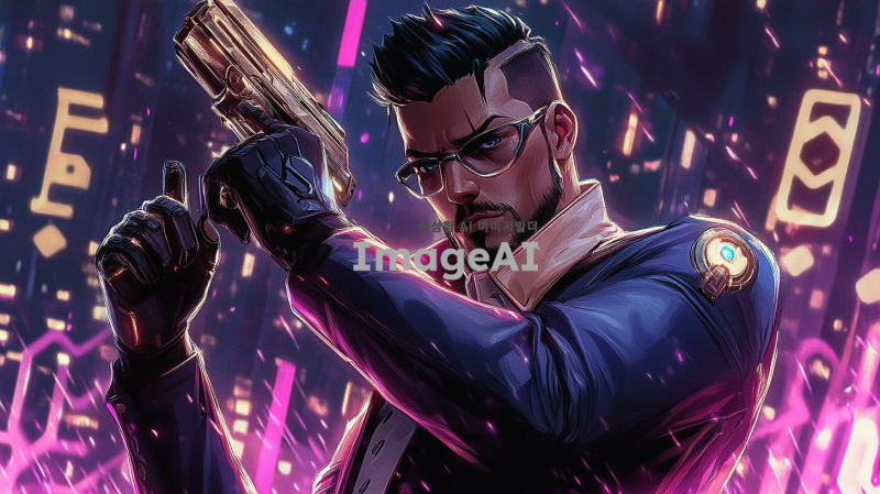 체임버가 발로란트 오퍼레이터를 양손으로 들고 있는 모습, 배경은 현대적인 도시의 야경, 체임버의 복장은 그의 시그니처 슈트 스타일, 주변에 네온 불빛이 반짝이는 분위기, 체임버의 표정은 자신감 있고 집중된 모습, 디테일한 그림체, 현실적이면서도 약간의 스타일리시한 터치., 만화같은 스타일