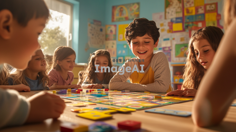 밝고 활기찬 분위기의 교실에서 아이들이 스플랜더 보드게임을 활용한 수학 놀이 활동을 하고 있는 장면. 다양한 나이대의 아이들이 함께 모여 게임을 즐기며 웃고 있는 모습. 교실 벽에는 수학 관련 포스터와 장식들이 걸려 있고, 테이블 위에는 스플랜더 게임 구성품들이 잘 정리되어 있는 모습. 창의적이고 즐거운 학습 환경을 강조하는 이미지. 배경은 깔끔하고 따뜻한 색감으로 표현.