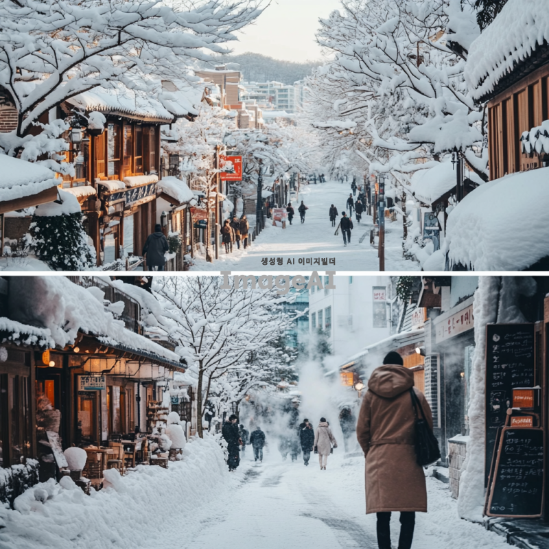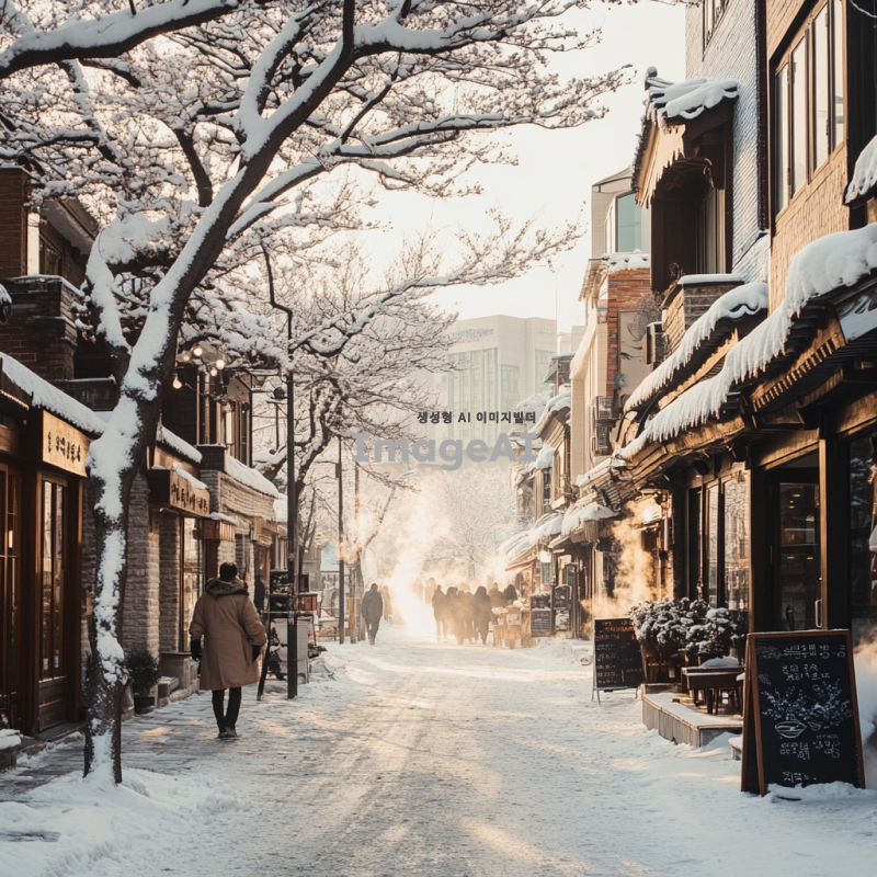 한국의 겨울 도시 풍경, 눈이 소복이 쌓인 거리, 따뜻한 불빛이 새어 나오는 창문, 눈 덮인 나무들, 겨울철 코트를 입고 걸어가는 사람들, 전통 한옥과 현대적인 건물이 조화를 이루는 모습, 차가운 공기를 표현한 맑은 하늘, 거리의 작은 카페에서 나오는 김, 포근하고 평화로운 분위기