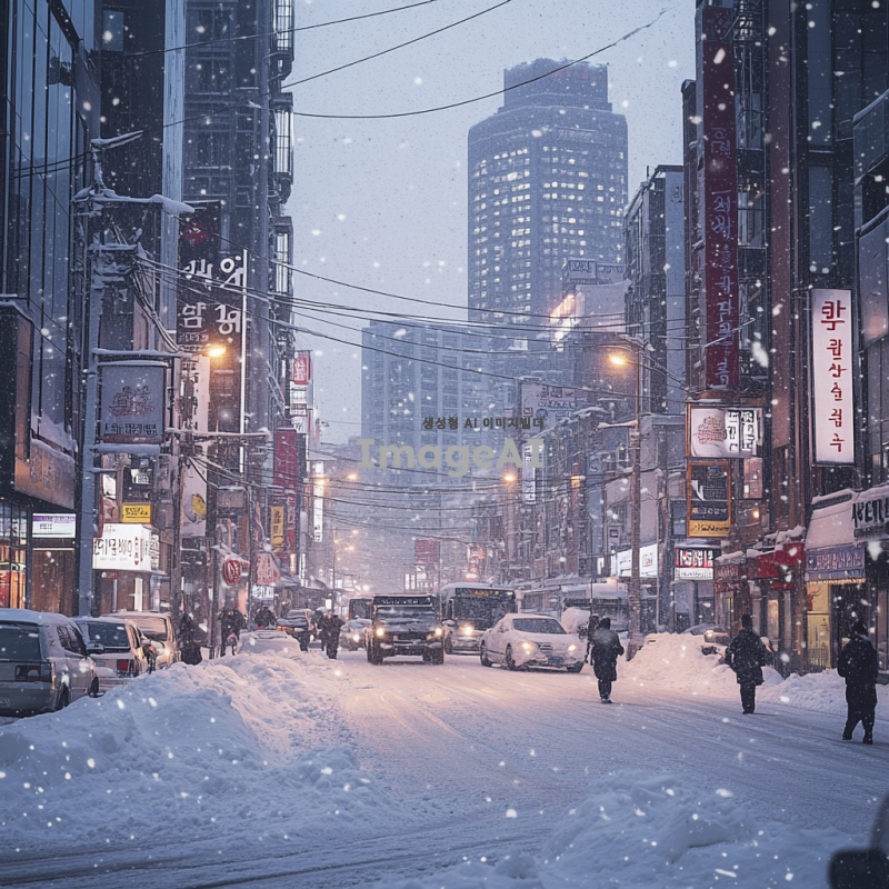 겨울철 눈이 내리는 한국의 도시 풍경, 고층 빌딩과 도로 위에 소복이 쌓인 눈, 거리의 가로등이 부드럽게 빛나고 있는 모습, 사람들이 따뜻한 옷을 입고 거리를 걷고 있는 장면, 포근하고 조용한 분위기, 하늘에서 내리는 눈송이가 공중에서 반짝이는 모습, 도시의 현대적이면서도 아늑한 느낌.