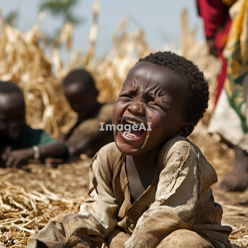 아프리카 한 마을에서 먹을게 없어서 울부짖고 있는 아이