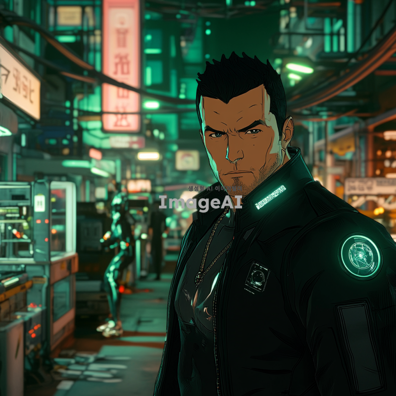 해킹으로 폐쇄된 연구소 앞에 블랙 슈트를 입은 도시 영웅이 서 있고 팔에는 갤럭시워치를 차고 있어. 배경은 미래도시 적인 느낌인데 네온 간판들이 멀리 눈에 띄기도 해