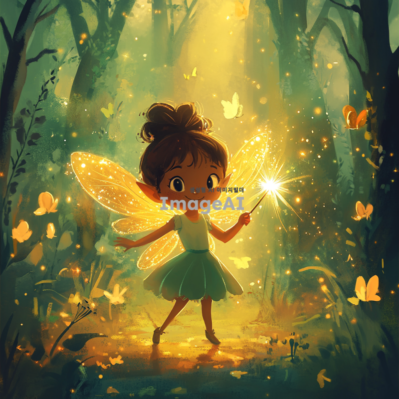 환상적인 숲 속에서 작은 날개를 가진 요정이 반짝이는 마법 지팡이를 들고 있는 모습. 요정은 밝고 따뜻한 미소를 지으며, 주변에는 은은한 빛이 감도는 신비로운 분위기. 요정의 옷은 자연에서 영감을 받은 초록색과 금색으로 장식되어 있으며, 주변에는 작은 꽃잎과 나비들이 함께 어우러져 있는 장면. 요정의 손짓에 따라 사라지는 실수의 흔적들이 마치 마법처럼 사라지는 모습.