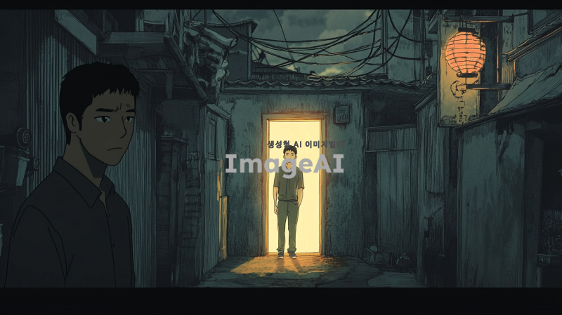 좌측에는 흐린 날씨 속에서 우울한 표정을 짓고 있는 한국인 남성이 서 있는 장면. 그의 주변은 어두운 색조로 표현되어 있으며, 고개를 약간 숙이고 있다. 중앙에는 밝은 빛이 새어 나오는 문이 있고, 문을 통과한 후 우측에는 맑은 날씨 속에서 밝고 활기찬 표정을 짓고 있는 한국인 남성이 서 있다. 그의 주변은 밝고 따뜻한 색조로 표현되어 있으며, 미소를 짓고 고개를 들고 있다. 문을 경계로 좌우의 분위기가 극명하게 대비되는 장면.
