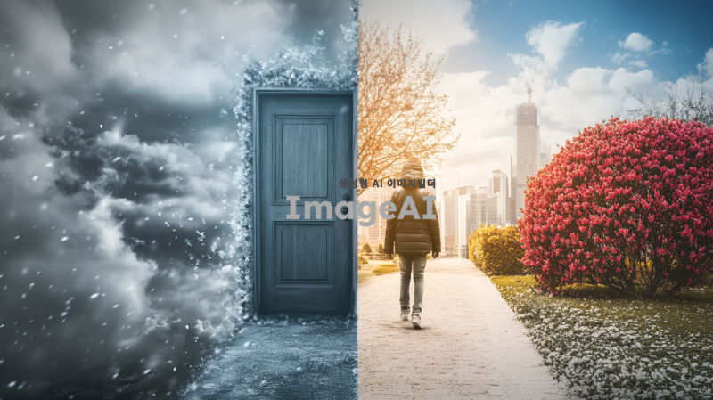 좌측에는 흐린 날씨와 어두운 색조의 배경, 고개를 숙이고 있는 사람 한 명이 있습니다. 우울한 분위기를 나타내기 위해 회색과 파란색의 조합을 사용합니다. 가운데에는 문이 있으며, 문을 통과한 후 우측에는 밝은 햇살과 따뜻한 색조의 배경, 미소를 지으며 활기차게 걷고 있는 사람이 있습니다. 우측 배경은 꽃이 만발한 정원이나 밝은 도시 풍경으로 설정합니다.