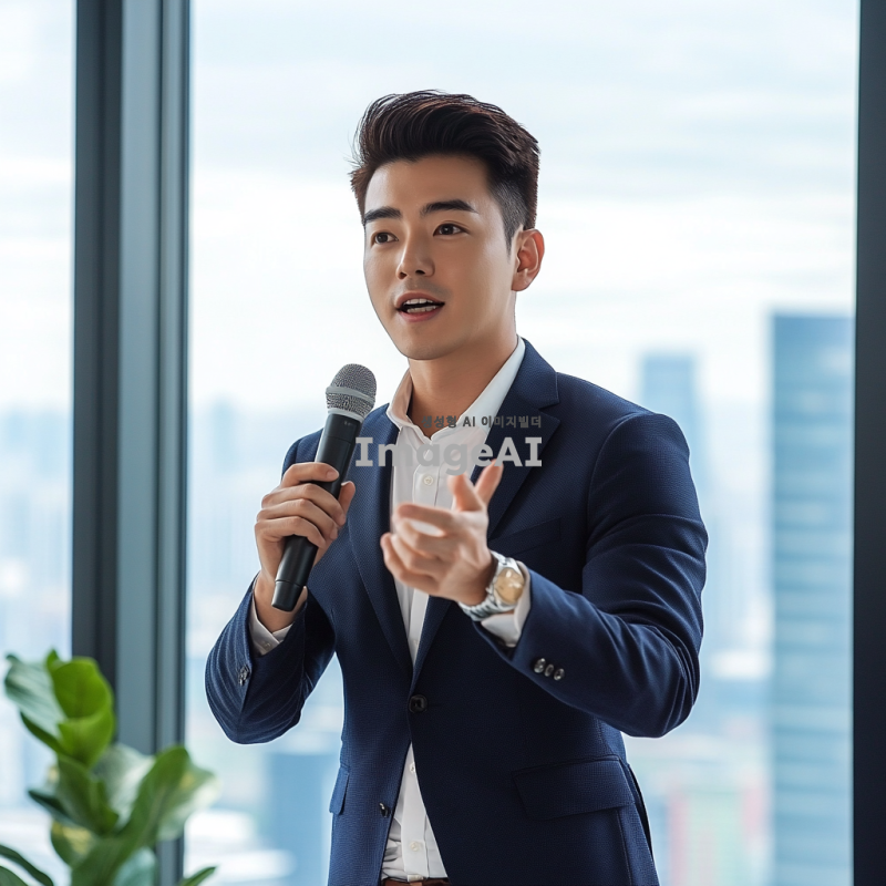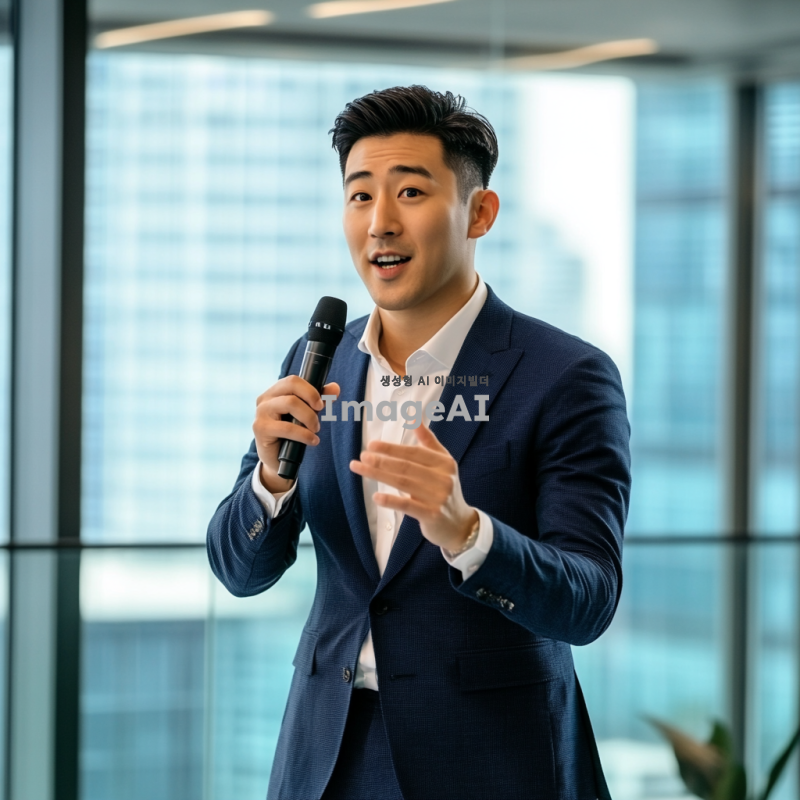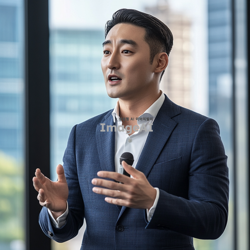 Prompt: Korean male presenter, stylish and clean business hairstyle, mid-presentation in a modern conference room, glass walls, cityscape visible outside, wearing a tailored navy suit, confident posture, holding a microphone, dynamic hand gestures, photorealistic, vibrant lighting, corporate professional mood