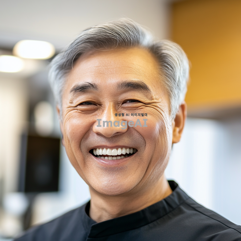 60대 한국인 노인이 치과 치료를 받고 만족스럽게 웃고 있는 모습, 밝고 편안한 분위기, 치과 내부 배경, 환한 조명, 환자의 얼굴에 기쁨과 안도감이 드러나는 표정, 깨끗하고 전문적인 치과 환경, 건강한 치아가 강조된 미소.
